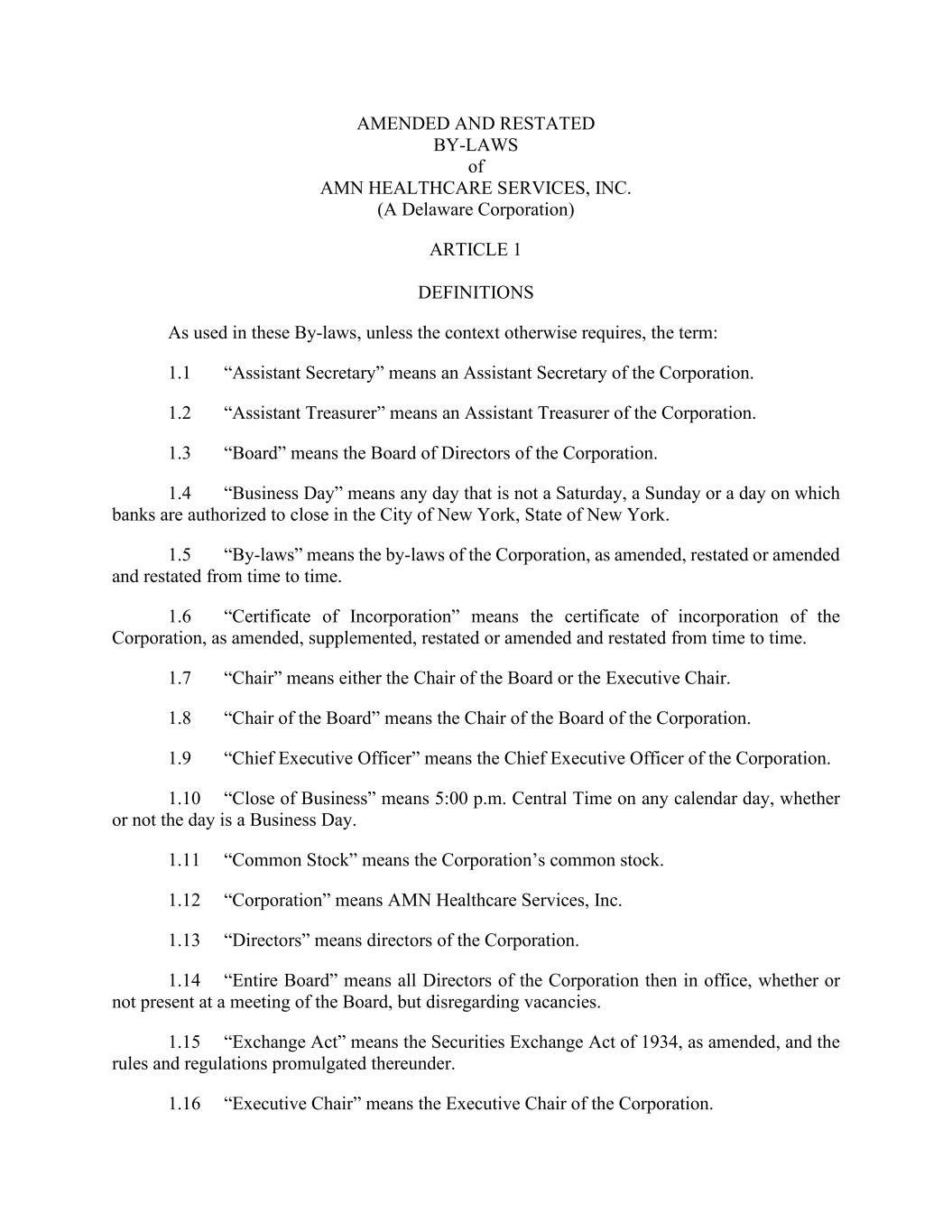 AMENDED AND RESTATED BY-LAWS of AMN HEALTHCARE SERVICES, INC. (A Delaware Corporation) ARTICLE 1 DEFINITIONS As used in these By-laws, unless the context otherwise requires, the term: 1.1 “Assistant Secretary” means an Assistant Secretary of the Corporation. 1.2 “Assistant Treasurer” means an Assistant Treasurer of the Corporation. 1.3 “Board” means the Board of Directors of the Corporation. 1.4 “Business Day” means any day that is not a Saturday, a Sunday or a day on which banks are authorized to close in the City of New York, State of New York. 1.5 “By-laws” means the by-laws of the Corporation, as amended, restated or amended and restated from time to time. 1.6 “Certificate of Incorporation” means the certificate of incorporation of the Corporation, as amended, supplemented, restated or amended and restated from time to time. 1.7 “Chair” means either the Chair of the Board or the Executive Chair. 1.8 “Chair of the Board” means the Chair of the Board of the Corporation. 1.9 “Chief Executive Officer” means the Chief Executive Officer of the Corporation. 1.10 “Close of Business” means 5:00 p.m. Central Time on any calendar day, whether or not the day is a Business Day. 1.11 “Common Stock” means the Corporation’s common stock. 1.12 “Corporation” means AMN Healthcare Services, Inc. 1.13 “Directors” means directors of the Corporation. 1.14 “Entire Board” means all Directors of the Corporation then in office, whether or not present at a meeting of the Board, but disregarding vacancies. 1.15 “Exchange Act” means the Securities Exchange Act of 1934, as amended, and the rules and regulations promulgated thereunder. 1.16 “Executive Chair” means the Executive Chair of the Corporation.