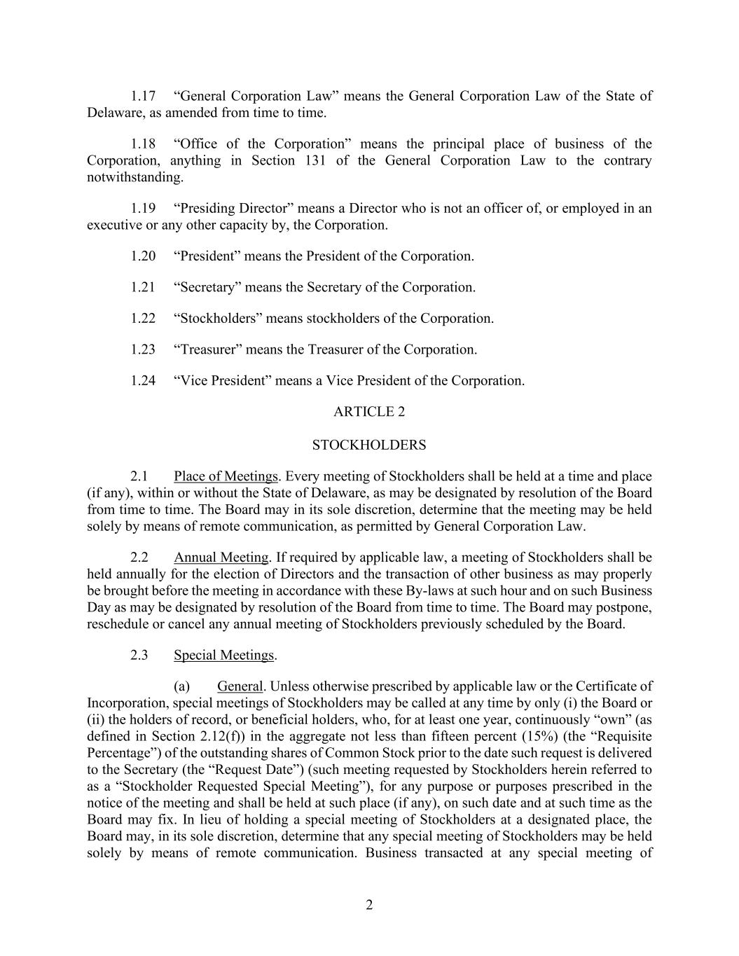 2 1.17 “General Corporation Law” means the General Corporation Law of the State of Delaware, as amended from time to time. 1.18 “Office of the Corporation” means the principal place of business of the Corporation, anything in Section 131 of the General Corporation Law to the contrary notwithstanding. 1.19 “Presiding Director” means a Director who is not an officer of, or employed in an executive or any other capacity by, the Corporation. 1.20 “President” means the President of the Corporation. 1.21 “Secretary” means the Secretary of the Corporation. 1.22 “Stockholders” means stockholders of the Corporation. 1.23 “Treasurer” means the Treasurer of the Corporation. 1.24 “Vice President” means a Vice President of the Corporation. ARTICLE 2 STOCKHOLDERS 2.1 Place of Meetings. Every meeting of Stockholders shall be held at a time and place (if any), within or without the State of Delaware, as may be designated by resolution of the Board from time to time. The Board may in its sole discretion, determine that the meeting may be held solely by means of remote communication, as permitted by General Corporation Law. 2.2 Annual Meeting. If required by applicable law, a meeting of Stockholders shall be held annually for the election of Directors and the transaction of other business as may properly be brought before the meeting in accordance with these By-laws at such hour and on such Business Day as may be designated by resolution of the Board from time to time. The Board may postpone, reschedule or cancel any annual meeting of Stockholders previously scheduled by the Board. 2.3 Special Meetings. (a) General. Unless otherwise prescribed by applicable law or the Certificate of Incorporation, special meetings of Stockholders may be called at any time by only (i) the Board or (ii) the holders of record, or beneficial holders, who, for at least one year, continuously “own” (as defined in Section 2.12(f)) in the aggregate not less than fifteen percent (15%) (the “Requisite Percentage”) of the outstanding shares of Common Stock prior to the date such request is delivered to the Secretary (the “Request Date”) (such meeting requested by Stockholders herein referred to as a “Stockholder Requested Special Meeting”), for any purpose or purposes prescribed in the notice of the meeting and shall be held at such place (if any), on such date and at such time as the Board may fix. In lieu of holding a special meeting of Stockholders at a designated place, the Board may, in its sole discretion, determine that any special meeting of Stockholders may be held solely by means of remote communication. Business transacted at any special meeting of
