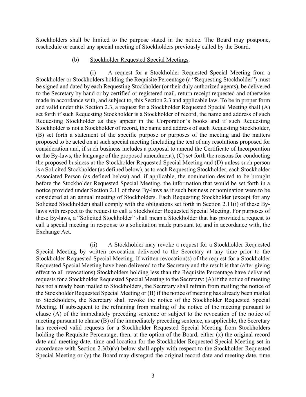 3 Stockholders shall be limited to the purpose stated in the notice. The Board may postpone, reschedule or cancel any special meeting of Stockholders previously called by the Board. (b) Stockholder Requested Special Meetings. (i) A request for a Stockholder Requested Special Meeting from a Stockholder or Stockholders holding the Requisite Percentage (a “Requesting Stockholder”) must be signed and dated by each Requesting Stockholder (or their duly authorized agents), be delivered to the Secretary by hand or by certified or registered mail, return receipt requested and otherwise made in accordance with, and subject to, this Section 2.3 and applicable law. To be in proper form and valid under this Section 2.3, a request for a Stockholder Requested Special Meeting shall (A) set forth if such Requesting Stockholder is a Stockholder of record, the name and address of such Requesting Stockholder as they appear in the Corporation’s books and if such Requesting Stockholder is not a Stockholder of record, the name and address of such Requesting Stockholder, (B) set forth a statement of the specific purpose or purposes of the meeting and the matters proposed to be acted on at such special meeting (including the text of any resolutions proposed for consideration and, if such business includes a proposal to amend the Certificate of Incorporation or the By-laws, the language of the proposed amendment), (C) set forth the reasons for conducting the proposed business at the Stockholder Requested Special Meeting and (D) unless such person is a Solicited Stockholder (as defined below), as to each Requesting Stockholder, each Stockholder Associated Person (as defined below) and, if applicable, the nomination desired to be brought before the Stockholder Requested Special Meeting, the information that would be set forth in a notice provided under Section 2.11 of these By-laws as if such business or nomination were to be considered at an annual meeting of Stockholders. Each Requesting Stockholder (except for any Solicited Stockholder) shall comply with the obligations set forth in Section 2.11(i) of these By- laws with respect to the request to call a Stockholder Requested Special Meeting. For purposes of these By-laws, a “Solicited Stockholder” shall mean a Stockholder that has provided a request to call a special meeting in response to a solicitation made pursuant to, and in accordance with, the Exchange Act. (ii) A Stockholder may revoke a request for a Stockholder Requested Special Meeting by written revocation delivered to the Secretary at any time prior to the Stockholder Requested Special Meeting. If written revocation(s) of the request for a Stockholder Requested Special Meeting have been delivered to the Secretary and the result is that (after giving effect to all revocations) Stockholders holding less than the Requisite Percentage have delivered requests for a Stockholder Requested Special Meeting to the Secretary: (A) if the notice of meeting has not already been mailed to Stockholders, the Secretary shall refrain from mailing the notice of the Stockholder Requested Special Meeting or (B) if the notice of meeting has already been mailed to Stockholders, the Secretary shall revoke the notice of the Stockholder Requested Special Meeting. If subsequent to the refraining from mailing of the notice of the meeting pursuant to clause (A) of the immediately preceding sentence or subject to the revocation of the notice of meeting pursuant to clause (B) of the immediately preceding sentence, as applicable, the Secretary has received valid requests for a Stockholder Requested Special Meeting from Stockholders holding the Requisite Percentage, then, at the option of the Board, either (x) the original record date and meeting date, time and location for the Stockholder Requested Special Meeting set in accordance with Section 2.3(b)(v) below shall apply with respect to the Stockholder Requested Special Meeting or (y) the Board may disregard the original record date and meeting date, time