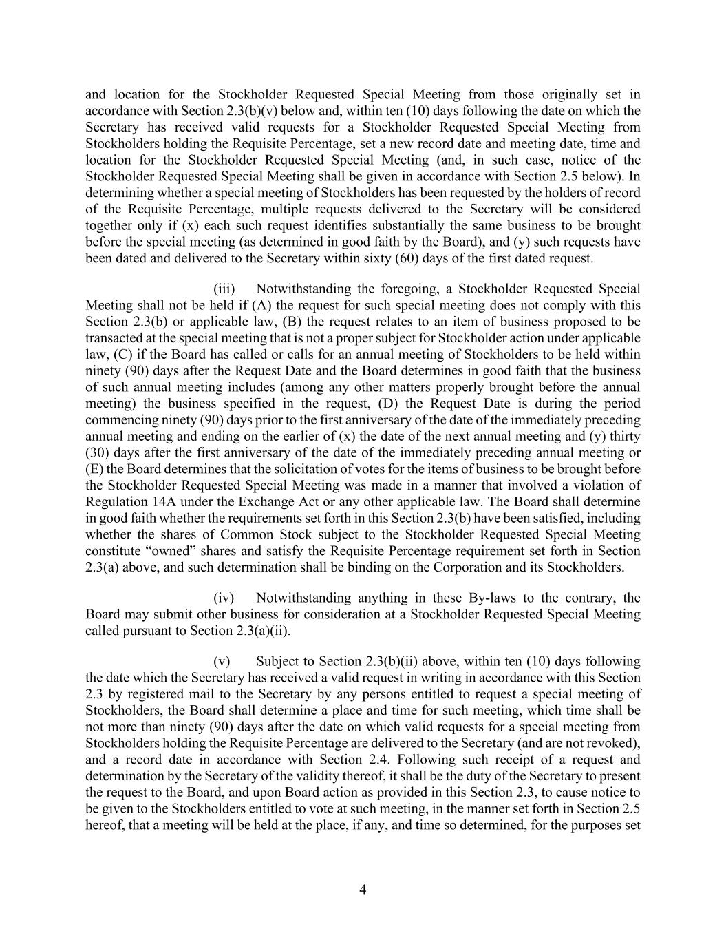 4 and location for the Stockholder Requested Special Meeting from those originally set in accordance with Section 2.3(b)(v) below and, within ten (10) days following the date on which the Secretary has received valid requests for a Stockholder Requested Special Meeting from Stockholders holding the Requisite Percentage, set a new record date and meeting date, time and location for the Stockholder Requested Special Meeting (and, in such case, notice of the Stockholder Requested Special Meeting shall be given in accordance with Section 2.5 below). In determining whether a special meeting of Stockholders has been requested by the holders of record of the Requisite Percentage, multiple requests delivered to the Secretary will be considered together only if (x) each such request identifies substantially the same business to be brought before the special meeting (as determined in good faith by the Board), and (y) such requests have been dated and delivered to the Secretary within sixty (60) days of the first dated request. (iii) Notwithstanding the foregoing, a Stockholder Requested Special Meeting shall not be held if (A) the request for such special meeting does not comply with this Section 2.3(b) or applicable law, (B) the request relates to an item of business proposed to be transacted at the special meeting that is not a proper subject for Stockholder action under applicable law, (C) if the Board has called or calls for an annual meeting of Stockholders to be held within ninety (90) days after the Request Date and the Board determines in good faith that the business of such annual meeting includes (among any other matters properly brought before the annual meeting) the business specified in the request, (D) the Request Date is during the period commencing ninety (90) days prior to the first anniversary of the date of the immediately preceding annual meeting and ending on the earlier of (x) the date of the next annual meeting and (y) thirty (30) days after the first anniversary of the date of the immediately preceding annual meeting or (E) the Board determines that the solicitation of votes for the items of business to be brought before the Stockholder Requested Special Meeting was made in a manner that involved a violation of Regulation 14A under the Exchange Act or any other applicable law. The Board shall determine in good faith whether the requirements set forth in this Section 2.3(b) have been satisfied, including whether the shares of Common Stock subject to the Stockholder Requested Special Meeting constitute “owned” shares and satisfy the Requisite Percentage requirement set forth in Section 2.3(a) above, and such determination shall be binding on the Corporation and its Stockholders. (iv) Notwithstanding anything in these By-laws to the contrary, the Board may submit other business for consideration at a Stockholder Requested Special Meeting called pursuant to Section 2.3(a)(ii). (v) Subject to Section 2.3(b)(ii) above, within ten (10) days following the date which the Secretary has received a valid request in writing in accordance with this Section 2.3 by registered mail to the Secretary by any persons entitled to request a special meeting of Stockholders, the Board shall determine a place and time for such meeting, which time shall be not more than ninety (90) days after the date on which valid requests for a special meeting from Stockholders holding the Requisite Percentage are delivered to the Secretary (and are not revoked), and a record date in accordance with Section 2.4. Following such receipt of a request and determination by the Secretary of the validity thereof, it shall be the duty of the Secretary to present the request to the Board, and upon Board action as provided in this Section 2.3, to cause notice to be given to the Stockholders entitled to vote at such meeting, in the manner set forth in Section 2.5 hereof, that a meeting will be held at the place, if any, and time so determined, for the purposes set
