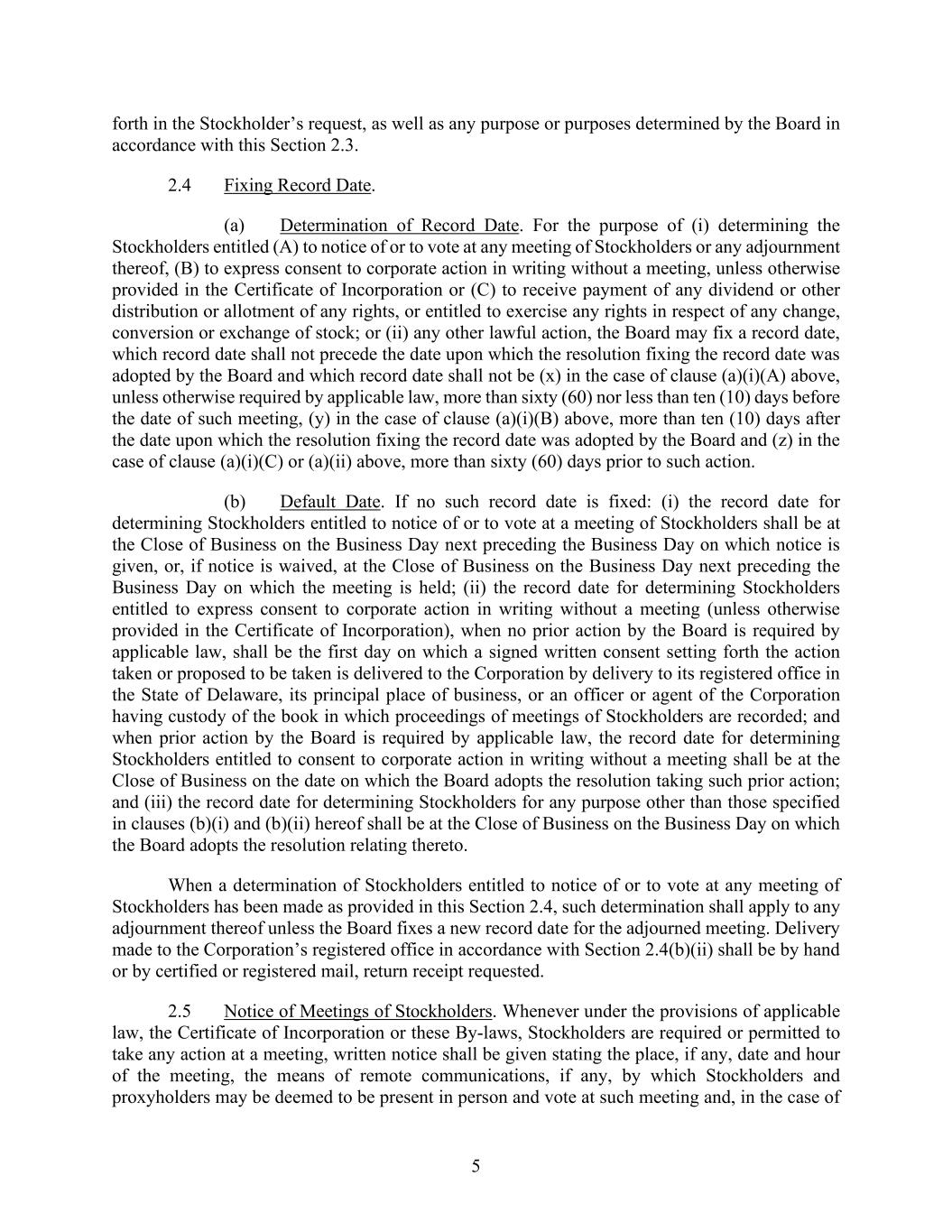 5 forth in the Stockholder’s request, as well as any purpose or purposes determined by the Board in accordance with this Section 2.3. 2.4 Fixing Record Date. (a) Determination of Record Date. For the purpose of (i) determining the Stockholders entitled (A) to notice of or to vote at any meeting of Stockholders or any adjournment thereof, (B) to express consent to corporate action in writing without a meeting, unless otherwise provided in the Certificate of Incorporation or (C) to receive payment of any dividend or other distribution or allotment of any rights, or entitled to exercise any rights in respect of any change, conversion or exchange of stock; or (ii) any other lawful action, the Board may fix a record date, which record date shall not precede the date upon which the resolution fixing the record date was adopted by the Board and which record date shall not be (x) in the case of clause (a)(i)(A) above, unless otherwise required by applicable law, more than sixty (60) nor less than ten (10) days before the date of such meeting, (y) in the case of clause (a)(i)(B) above, more than ten (10) days after the date upon which the resolution fixing the record date was adopted by the Board and (z) in the case of clause (a)(i)(C) or (a)(ii) above, more than sixty (60) days prior to such action. (b) Default Date. If no such record date is fixed: (i) the record date for determining Stockholders entitled to notice of or to vote at a meeting of Stockholders shall be at the Close of Business on the Business Day next preceding the Business Day on which notice is given, or, if notice is waived, at the Close of Business on the Business Day next preceding the Business Day on which the meeting is held; (ii) the record date for determining Stockholders entitled to express consent to corporate action in writing without a meeting (unless otherwise provided in the Certificate of Incorporation), when no prior action by the Board is required by applicable law, shall be the first day on which a signed written consent setting forth the action taken or proposed to be taken is delivered to the Corporation by delivery to its registered office in the State of Delaware, its principal place of business, or an officer or agent of the Corporation having custody of the book in which proceedings of meetings of Stockholders are recorded; and when prior action by the Board is required by applicable law, the record date for determining Stockholders entitled to consent to corporate action in writing without a meeting shall be at the Close of Business on the date on which the Board adopts the resolution taking such prior action; and (iii) the record date for determining Stockholders for any purpose other than those specified in clauses (b)(i) and (b)(ii) hereof shall be at the Close of Business on the Business Day on which the Board adopts the resolution relating thereto. When a determination of Stockholders entitled to notice of or to vote at any meeting of Stockholders has been made as provided in this Section 2.4, such determination shall apply to any adjournment thereof unless the Board fixes a new record date for the adjourned meeting. Delivery made to the Corporation’s registered office in accordance with Section 2.4(b)(ii) shall be by hand or by certified or registered mail, return receipt requested. 2.5 Notice of Meetings of Stockholders. Whenever under the provisions of applicable law, the Certificate of Incorporation or these By-laws, Stockholders are required or permitted to take any action at a meeting, written notice shall be given stating the place, if any, date and hour of the meeting, the means of remote communications, if any, by which Stockholders and proxyholders may be deemed to be present in person and vote at such meeting and, in the case of