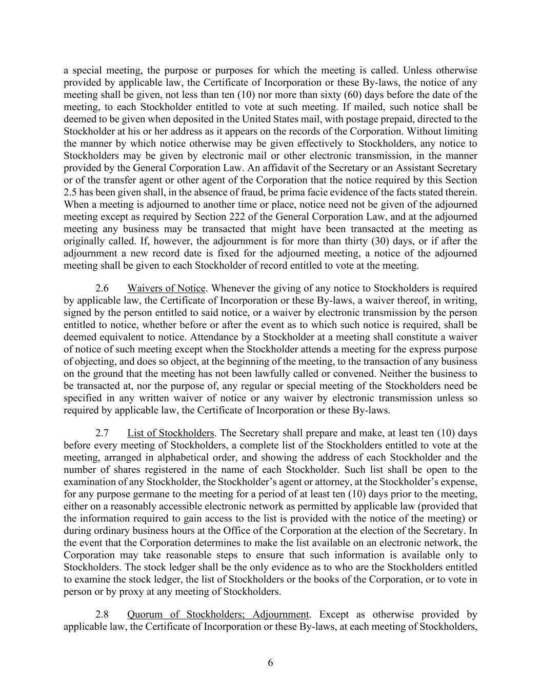 6 a special meeting, the purpose or purposes for which the meeting is called. Unless otherwise provided by applicable law, the Certificate of Incorporation or these By-laws, the notice of any meeting shall be given, not less than ten (10) nor more than sixty (60) days before the date of the meeting, to each Stockholder entitled to vote at such meeting. If mailed, such notice shall be deemed to be given when deposited in the United States mail, with postage prepaid, directed to the Stockholder at his or her address as it appears on the records of the Corporation. Without limiting the manner by which notice otherwise may be given effectively to Stockholders, any notice to Stockholders may be given by electronic mail or other electronic transmission, in the manner provided by the General Corporation Law. An affidavit of the Secretary or an Assistant Secretary or of the transfer agent or other agent of the Corporation that the notice required by this Section 2.5 has been given shall, in the absence of fraud, be prima facie evidence of the facts stated therein. When a meeting is adjourned to another time or place, notice need not be given of the adjourned meeting except as required by Section 222 of the General Corporation Law, and at the adjourned meeting any business may be transacted that might have been transacted at the meeting as originally called. If, however, the adjournment is for more than thirty (30) days, or if after the adjournment a new record date is fixed for the adjourned meeting, a notice of the adjourned meeting shall be given to each Stockholder of record entitled to vote at the meeting. 2.6 Waivers of Notice. Whenever the giving of any notice to Stockholders is required by applicable law, the Certificate of Incorporation or these By-laws, a waiver thereof, in writing, signed by the person entitled to said notice, or a waiver by electronic transmission by the person entitled to notice, whether before or after the event as to which such notice is required, shall be deemed equivalent to notice. Attendance by a Stockholder at a meeting shall constitute a waiver of notice of such meeting except when the Stockholder attends a meeting for the express purpose of objecting, and does so object, at the beginning of the meeting, to the transaction of any business on the ground that the meeting has not been lawfully called or convened. Neither the business to be transacted at, nor the purpose of, any regular or special meeting of the Stockholders need be specified in any written waiver of notice or any waiver by electronic transmission unless so required by applicable law, the Certificate of Incorporation or these By-laws. 2.7 List of Stockholders. The Secretary shall prepare and make, at least ten (10) days before every meeting of Stockholders, a complete list of the Stockholders entitled to vote at the meeting, arranged in alphabetical order, and showing the address of each Stockholder and the number of shares registered in the name of each Stockholder. Such list shall be open to the examination of any Stockholder, the Stockholder’s agent or attorney, at the Stockholder’s expense, for any purpose germane to the meeting for a period of at least ten (10) days prior to the meeting, either on a reasonably accessible electronic network as permitted by applicable law (provided that the information required to gain access to the list is provided with the notice of the meeting) or during ordinary business hours at the Office of the Corporation at the election of the Secretary. In the event that the Corporation determines to make the list available on an electronic network, the Corporation may take reasonable steps to ensure that such information is available only to Stockholders. The stock ledger shall be the only evidence as to who are the Stockholders entitled to examine the stock ledger, the list of Stockholders or the books of the Corporation, or to vote in person or by proxy at any meeting of Stockholders. 2.8 Quorum of Stockholders; Adjournment. Except as otherwise provided by applicable law, the Certificate of Incorporation or these By-laws, at each meeting of Stockholders,