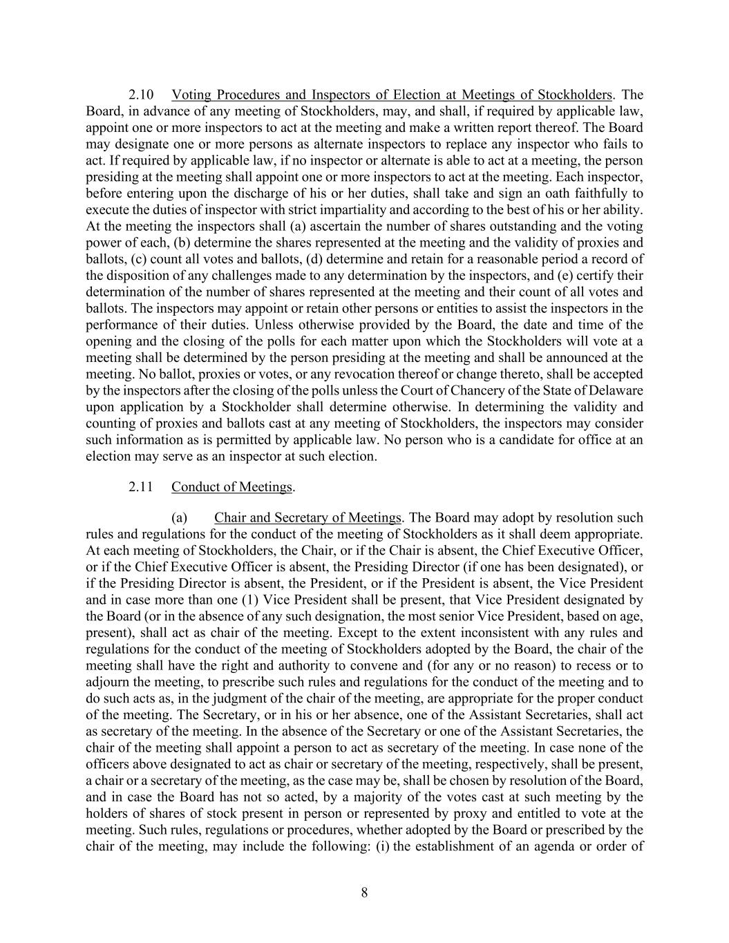 8 2.10 Voting Procedures and Inspectors of Election at Meetings of Stockholders. The Board, in advance of any meeting of Stockholders, may, and shall, if required by applicable law, appoint one or more inspectors to act at the meeting and make a written report thereof. The Board may designate one or more persons as alternate inspectors to replace any inspector who fails to act. If required by applicable law, if no inspector or alternate is able to act at a meeting, the person presiding at the meeting shall appoint one or more inspectors to act at the meeting. Each inspector, before entering upon the discharge of his or her duties, shall take and sign an oath faithfully to execute the duties of inspector with strict impartiality and according to the best of his or her ability. At the meeting the inspectors shall (a) ascertain the number of shares outstanding and the voting power of each, (b) determine the shares represented at the meeting and the validity of proxies and ballots, (c) count all votes and ballots, (d) determine and retain for a reasonable period a record of the disposition of any challenges made to any determination by the inspectors, and (e) certify their determination of the number of shares represented at the meeting and their count of all votes and ballots. The inspectors may appoint or retain other persons or entities to assist the inspectors in the performance of their duties. Unless otherwise provided by the Board, the date and time of the opening and the closing of the polls for each matter upon which the Stockholders will vote at a meeting shall be determined by the person presiding at the meeting and shall be announced at the meeting. No ballot, proxies or votes, or any revocation thereof or change thereto, shall be accepted by the inspectors after the closing of the polls unless the Court of Chancery of the State of Delaware upon application by a Stockholder shall determine otherwise. In determining the validity and counting of proxies and ballots cast at any meeting of Stockholders, the inspectors may consider such information as is permitted by applicable law. No person who is a candidate for office at an election may serve as an inspector at such election. 2.11 Conduct of Meetings. (a) Chair and Secretary of Meetings. The Board may adopt by resolution such rules and regulations for the conduct of the meeting of Stockholders as it shall deem appropriate. At each meeting of Stockholders, the Chair, or if the Chair is absent, the Chief Executive Officer, or if the Chief Executive Officer is absent, the Presiding Director (if one has been designated), or if the Presiding Director is absent, the President, or if the President is absent, the Vice President and in case more than one (1) Vice President shall be present, that Vice President designated by the Board (or in the absence of any such designation, the most senior Vice President, based on age, present), shall act as chair of the meeting. Except to the extent inconsistent with any rules and regulations for the conduct of the meeting of Stockholders adopted by the Board, the chair of the meeting shall have the right and authority to convene and (for any or no reason) to recess or to adjourn the meeting, to prescribe such rules and regulations for the conduct of the meeting and to do such acts as, in the judgment of the chair of the meeting, are appropriate for the proper conduct of the meeting. The Secretary, or in his or her absence, one of the Assistant Secretaries, shall act as secretary of the meeting. In the absence of the Secretary or one of the Assistant Secretaries, the chair of the meeting shall appoint a person to act as secretary of the meeting. In case none of the officers above designated to act as chair or secretary of the meeting, respectively, shall be present, a chair or a secretary of the meeting, as the case may be, shall be chosen by resolution of the Board, and in case the Board has not so acted, by a majority of the votes cast at such meeting by the holders of shares of stock present in person or represented by proxy and entitled to vote at the meeting. Such rules, regulations or procedures, whether adopted by the Board or prescribed by the chair of the meeting, may include the following: (i) the establishment of an agenda or order of