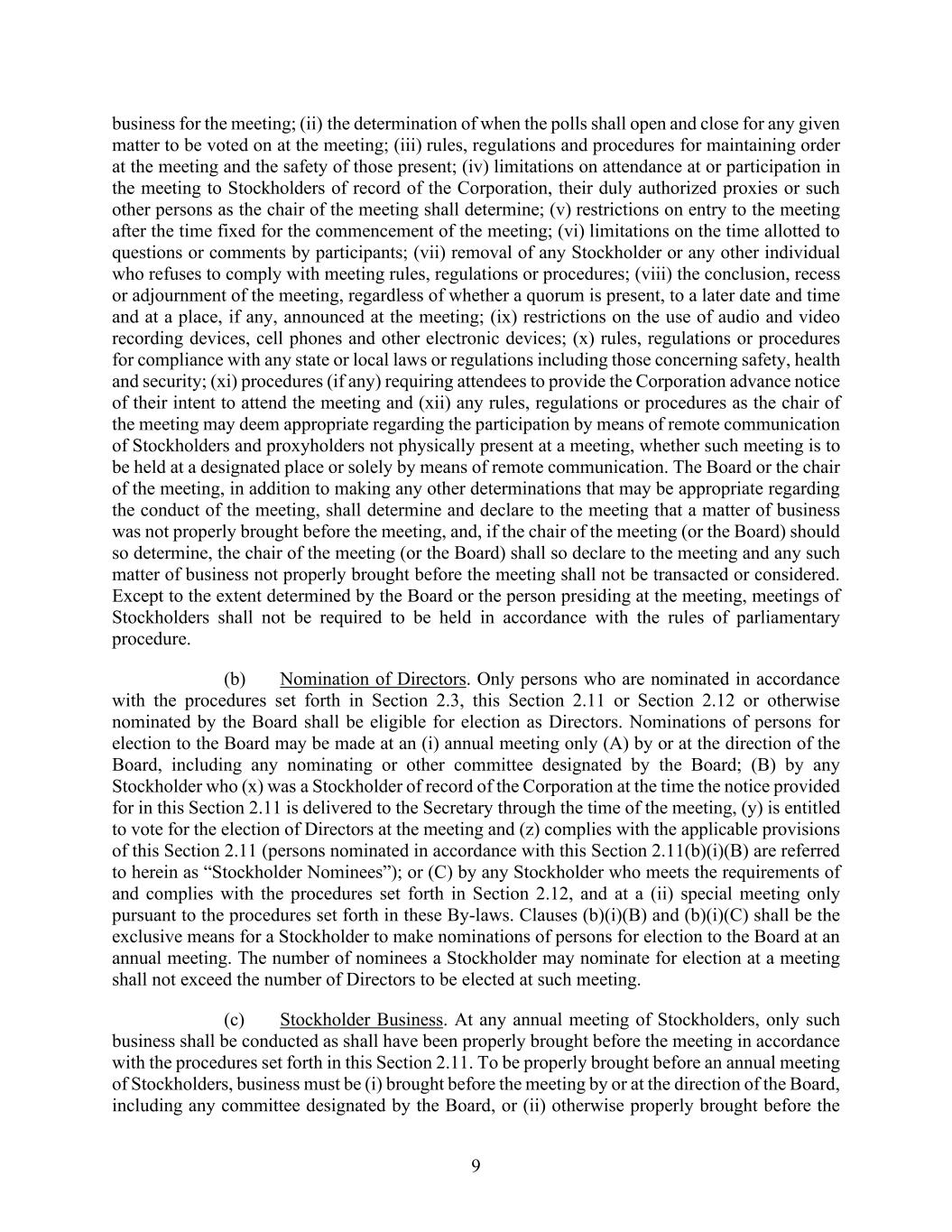 9 business for the meeting; (ii) the determination of when the polls shall open and close for any given matter to be voted on at the meeting; (iii) rules, regulations and procedures for maintaining order at the meeting and the safety of those present; (iv) limitations on attendance at or participation in the meeting to Stockholders of record of the Corporation, their duly authorized proxies or such other persons as the chair of the meeting shall determine; (v) restrictions on entry to the meeting after the time fixed for the commencement of the meeting; (vi) limitations on the time allotted to questions or comments by participants; (vii) removal of any Stockholder or any other individual who refuses to comply with meeting rules, regulations or procedures; (viii) the conclusion, recess or adjournment of the meeting, regardless of whether a quorum is present, to a later date and time and at a place, if any, announced at the meeting; (ix) restrictions on the use of audio and video recording devices, cell phones and other electronic devices; (x) rules, regulations or procedures for compliance with any state or local laws or regulations including those concerning safety, health and security; (xi) procedures (if any) requiring attendees to provide the Corporation advance notice of their intent to attend the meeting and (xii) any rules, regulations or procedures as the chair of the meeting may deem appropriate regarding the participation by means of remote communication of Stockholders and proxyholders not physically present at a meeting, whether such meeting is to be held at a designated place or solely by means of remote communication. The Board or the chair of the meeting, in addition to making any other determinations that may be appropriate regarding the conduct of the meeting, shall determine and declare to the meeting that a matter of business was not properly brought before the meeting, and, if the chair of the meeting (or the Board) should so determine, the chair of the meeting (or the Board) shall so declare to the meeting and any such matter of business not properly brought before the meeting shall not be transacted or considered. Except to the extent determined by the Board or the person presiding at the meeting, meetings of Stockholders shall not be required to be held in accordance with the rules of parliamentary procedure. (b) Nomination of Directors. Only persons who are nominated in accordance with the procedures set forth in Section 2.3, this Section 2.11 or Section 2.12 or otherwise nominated by the Board shall be eligible for election as Directors. Nominations of persons for election to the Board may be made at an (i) annual meeting only (A) by or at the direction of the Board, including any nominating or other committee designated by the Board; (B) by any Stockholder who (x) was a Stockholder of record of the Corporation at the time the notice provided for in this Section 2.11 is delivered to the Secretary through the time of the meeting, (y) is entitled to vote for the election of Directors at the meeting and (z) complies with the applicable provisions of this Section 2.11 (persons nominated in accordance with this Section 2.11(b)(i)(B) are referred to herein as “Stockholder Nominees”); or (C) by any Stockholder who meets the requirements of and complies with the procedures set forth in Section 2.12, and at a (ii) special meeting only pursuant to the procedures set forth in these By-laws. Clauses (b)(i)(B) and (b)(i)(C) shall be the exclusive means for a Stockholder to make nominations of persons for election to the Board at an annual meeting. The number of nominees a Stockholder may nominate for election at a meeting shall not exceed the number of Directors to be elected at such meeting. (c) Stockholder Business. At any annual meeting of Stockholders, only such business shall be conducted as shall have been properly brought before the meeting in accordance with the procedures set forth in this Section 2.11. To be properly brought before an annual meeting of Stockholders, business must be (i) brought before the meeting by or at the direction of the Board, including any committee designated by the Board, or (ii) otherwise properly brought before the