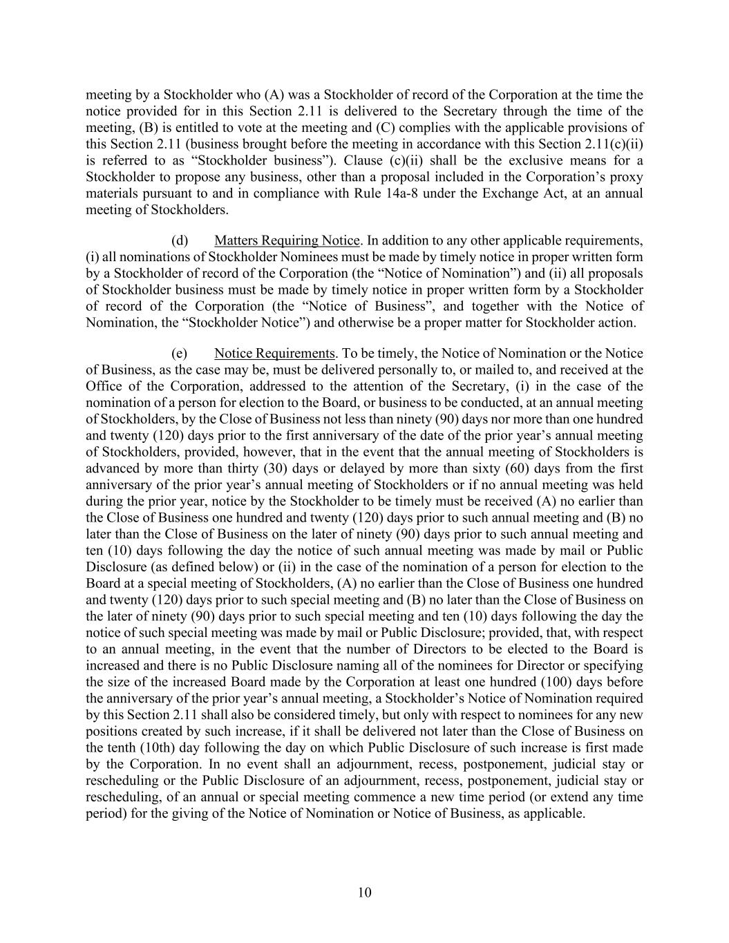 10 meeting by a Stockholder who (A) was a Stockholder of record of the Corporation at the time the notice provided for in this Section 2.11 is delivered to the Secretary through the time of the meeting, (B) is entitled to vote at the meeting and (C) complies with the applicable provisions of this Section 2.11 (business brought before the meeting in accordance with this Section 2.11(c)(ii) is referred to as “Stockholder business”). Clause (c)(ii) shall be the exclusive means for a Stockholder to propose any business, other than a proposal included in the Corporation’s proxy materials pursuant to and in compliance with Rule 14a-8 under the Exchange Act, at an annual meeting of Stockholders. (d) Matters Requiring Notice. In addition to any other applicable requirements, (i) all nominations of Stockholder Nominees must be made by timely notice in proper written form by a Stockholder of record of the Corporation (the “Notice of Nomination”) and (ii) all proposals of Stockholder business must be made by timely notice in proper written form by a Stockholder of record of the Corporation (the “Notice of Business”, and together with the Notice of Nomination, the “Stockholder Notice”) and otherwise be a proper matter for Stockholder action. (e) Notice Requirements. To be timely, the Notice of Nomination or the Notice of Business, as the case may be, must be delivered personally to, or mailed to, and received at the Office of the Corporation, addressed to the attention of the Secretary, (i) in the case of the nomination of a person for election to the Board, or business to be conducted, at an annual meeting of Stockholders, by the Close of Business not less than ninety (90) days nor more than one hundred and twenty (120) days prior to the first anniversary of the date of the prior year’s annual meeting of Stockholders, provided, however, that in the event that the annual meeting of Stockholders is advanced by more than thirty (30) days or delayed by more than sixty (60) days from the first anniversary of the prior year’s annual meeting of Stockholders or if no annual meeting was held during the prior year, notice by the Stockholder to be timely must be received (A) no earlier than the Close of Business one hundred and twenty (120) days prior to such annual meeting and (B) no later than the Close of Business on the later of ninety (90) days prior to such annual meeting and ten (10) days following the day the notice of such annual meeting was made by mail or Public Disclosure (as defined below) or (ii) in the case of the nomination of a person for election to the Board at a special meeting of Stockholders, (A) no earlier than the Close of Business one hundred and twenty (120) days prior to such special meeting and (B) no later than the Close of Business on the later of ninety (90) days prior to such special meeting and ten (10) days following the day the notice of such special meeting was made by mail or Public Disclosure; provided, that, with respect to an annual meeting, in the event that the number of Directors to be elected to the Board is increased and there is no Public Disclosure naming all of the nominees for Director or specifying the size of the increased Board made by the Corporation at least one hundred (100) days before the anniversary of the prior year’s annual meeting, a Stockholder’s Notice of Nomination required by this Section 2.11 shall also be considered timely, but only with respect to nominees for any new positions created by such increase, if it shall be delivered not later than the Close of Business on the tenth (10th) day following the day on which Public Disclosure of such increase is first made by the Corporation. In no event shall an adjournment, recess, postponement, judicial stay or rescheduling or the Public Disclosure of an adjournment, recess, postponement, judicial stay or rescheduling, of an annual or special meeting commence a new time period (or extend any time period) for the giving of the Notice of Nomination or Notice of Business, as applicable.