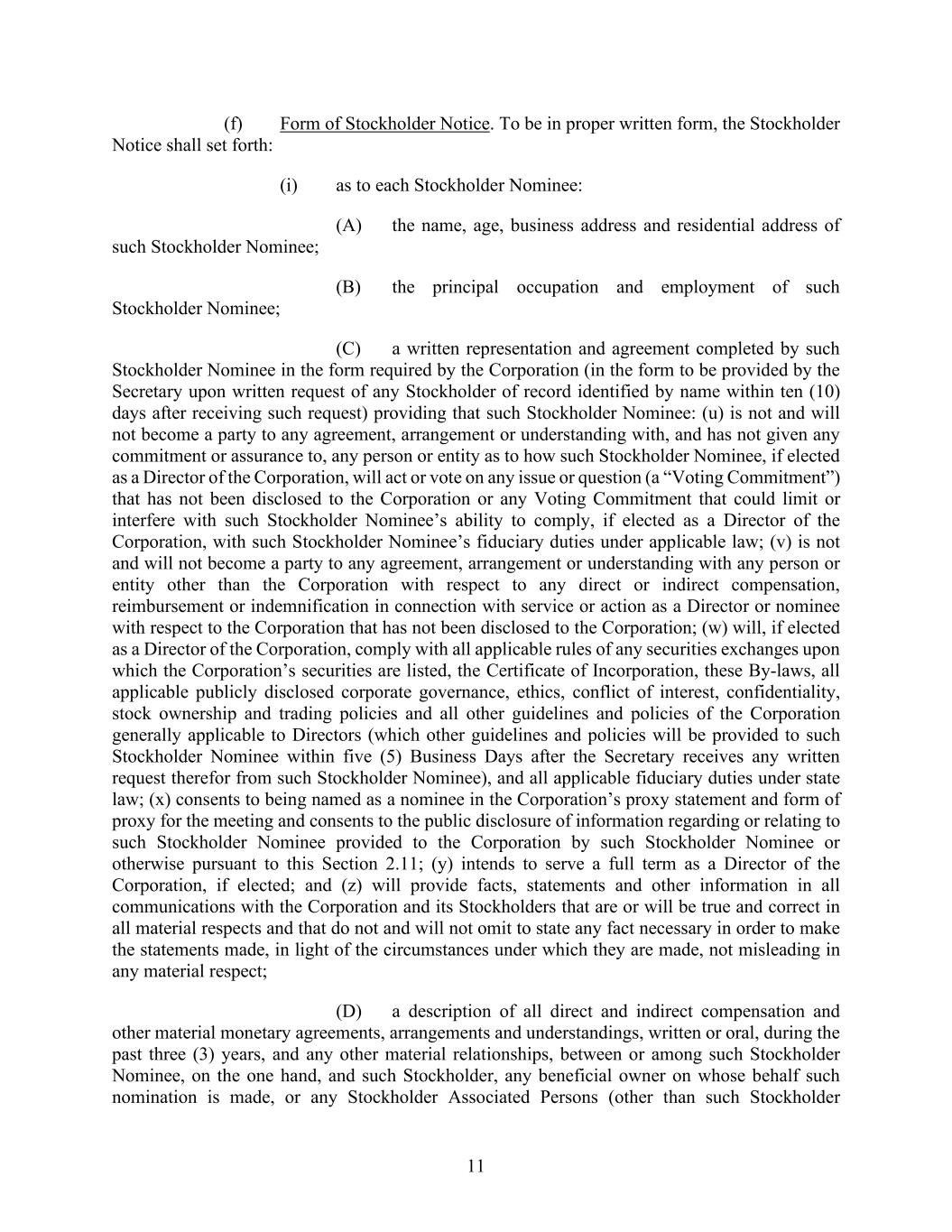 11 (f) Form of Stockholder Notice. To be in proper written form, the Stockholder Notice shall set forth: (i) as to each Stockholder Nominee: (A) the name, age, business address and residential address of such Stockholder Nominee; (B) the principal occupation and employment of such Stockholder Nominee; (C) a written representation and agreement completed by such Stockholder Nominee in the form required by the Corporation (in the form to be provided by the Secretary upon written request of any Stockholder of record identified by name within ten (10) days after receiving such request) providing that such Stockholder Nominee: (u) is not and will not become a party to any agreement, arrangement or understanding with, and has not given any commitment or assurance to, any person or entity as to how such Stockholder Nominee, if elected as a Director of the Corporation, will act or vote on any issue or question (a “Voting Commitment”) that has not been disclosed to the Corporation or any Voting Commitment that could limit or interfere with such Stockholder Nominee’s ability to comply, if elected as a Director of the Corporation, with such Stockholder Nominee’s fiduciary duties under applicable law; (v) is not and will not become a party to any agreement, arrangement or understanding with any person or entity other than the Corporation with respect to any direct or indirect compensation, reimbursement or indemnification in connection with service or action as a Director or nominee with respect to the Corporation that has not been disclosed to the Corporation; (w) will, if elected as a Director of the Corporation, comply with all applicable rules of any securities exchanges upon which the Corporation’s securities are listed, the Certificate of Incorporation, these By-laws, all applicable publicly disclosed corporate governance, ethics, conflict of interest, confidentiality, stock ownership and trading policies and all other guidelines and policies of the Corporation generally applicable to Directors (which other guidelines and policies will be provided to such Stockholder Nominee within five (5) Business Days after the Secretary receives any written request therefor from such Stockholder Nominee), and all applicable fiduciary duties under state law; (x) consents to being named as a nominee in the Corporation’s proxy statement and form of proxy for the meeting and consents to the public disclosure of information regarding or relating to such Stockholder Nominee provided to the Corporation by such Stockholder Nominee or otherwise pursuant to this Section 2.11; (y) intends to serve a full term as a Director of the Corporation, if elected; and (z) will provide facts, statements and other information in all communications with the Corporation and its Stockholders that are or will be true and correct in all material respects and that do not and will not omit to state any fact necessary in order to make the statements made, in light of the circumstances under which they are made, not misleading in any material respect; (D) a description of all direct and indirect compensation and other material monetary agreements, arrangements and understandings, written or oral, during the past three (3) years, and any other material relationships, between or among such Stockholder Nominee, on the one hand, and such Stockholder, any beneficial owner on whose behalf such nomination is made, or any Stockholder Associated Persons (other than such Stockholder