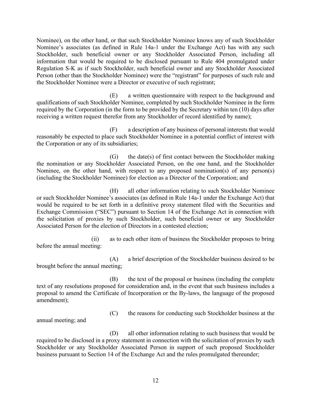 12 Nominee), on the other hand, or that such Stockholder Nominee knows any of such Stockholder Nominee’s associates (as defined in Rule 14a-1 under the Exchange Act) has with any such Stockholder, such beneficial owner or any Stockholder Associated Person, including all information that would be required to be disclosed pursuant to Rule 404 promulgated under Regulation S-K as if such Stockholder, such beneficial owner and any Stockholder Associated Person (other than the Stockholder Nominee) were the “registrant” for purposes of such rule and the Stockholder Nominee were a Director or executive of such registrant; (E) a written questionnaire with respect to the background and qualifications of such Stockholder Nominee, completed by such Stockholder Nominee in the form required by the Corporation (in the form to be provided by the Secretary within ten (10) days after receiving a written request therefor from any Stockholder of record identified by name); (F) a description of any business of personal interests that would reasonably be expected to place such Stockholder Nominee in a potential conflict of interest with the Corporation or any of its subsidiaries; (G) the date(s) of first contact between the Stockholder making the nomination or any Stockholder Associated Person, on the one hand, and the Stockholder Nominee, on the other hand, with respect to any proposed nomination(s) of any person(s) (including the Stockholder Nominee) for election as a Director of the Corporation; and (H) all other information relating to such Stockholder Nominee or such Stockholder Nominee’s associates (as defined in Rule 14a-1 under the Exchange Act) that would be required to be set forth in a definitive proxy statement filed with the Securities and Exchange Commission (“SEC”) pursuant to Section 14 of the Exchange Act in connection with the solicitation of proxies by such Stockholder, such beneficial owner or any Stockholder Associated Person for the election of Directors in a contested election; (ii) as to each other item of business the Stockholder proposes to bring before the annual meeting: (A) a brief description of the Stockholder business desired to be brought before the annual meeting; (B) the text of the proposal or business (including the complete text of any resolutions proposed for consideration and, in the event that such business includes a proposal to amend the Certificate of Incorporation or the By-laws, the language of the proposed amendment); (C) the reasons for conducting such Stockholder business at the annual meeting; and (D) all other information relating to such business that would be required to be disclosed in a proxy statement in connection with the solicitation of proxies by such Stockholder or any Stockholder Associated Person in support of such proposed Stockholder business pursuant to Section 14 of the Exchange Act and the rules promulgated thereunder;