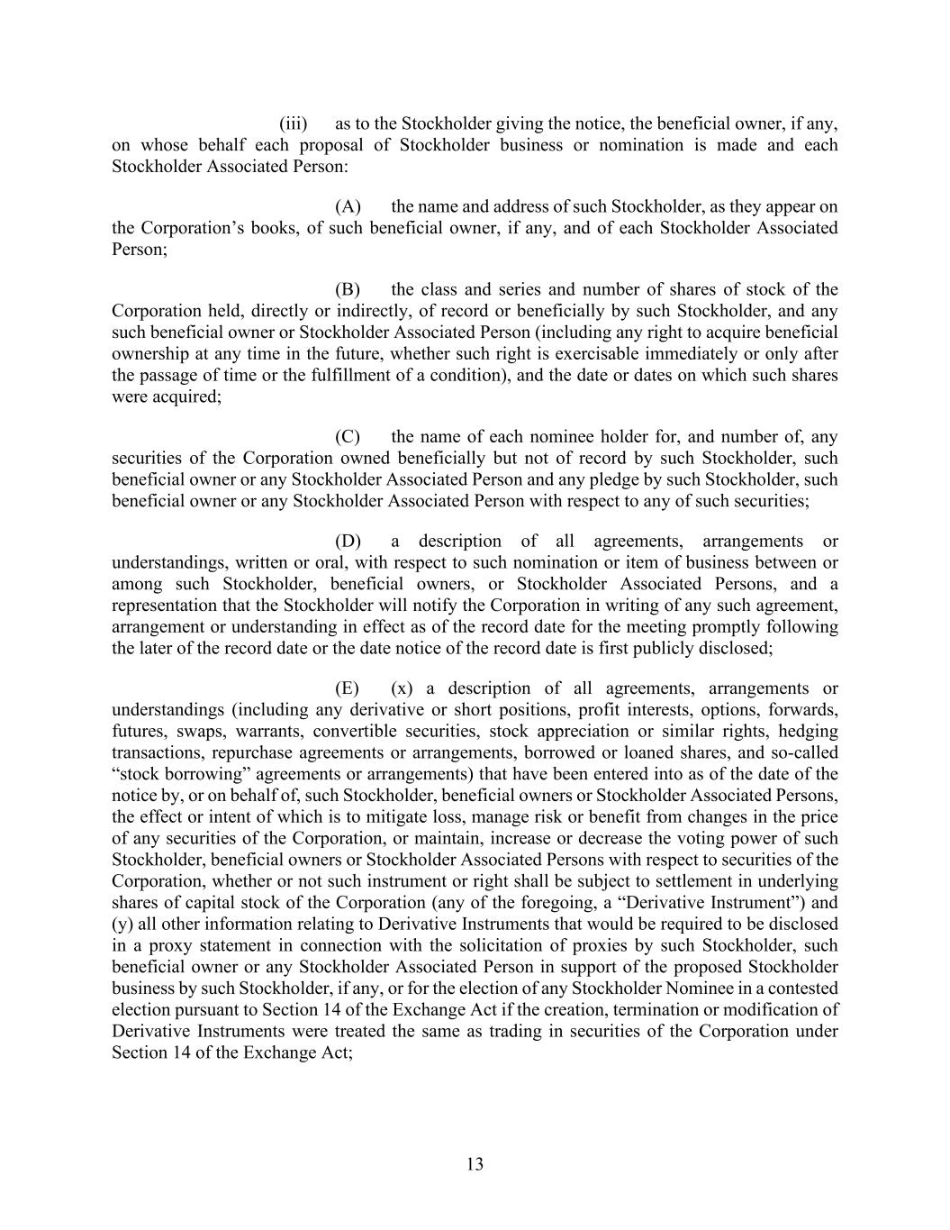 13 (iii) as to the Stockholder giving the notice, the beneficial owner, if any, on whose behalf each proposal of Stockholder business or nomination is made and each Stockholder Associated Person: (A) the name and address of such Stockholder, as they appear on the Corporation’s books, of such beneficial owner, if any, and of each Stockholder Associated Person; (B) the class and series and number of shares of stock of the Corporation held, directly or indirectly, of record or beneficially by such Stockholder, and any such beneficial owner or Stockholder Associated Person (including any right to acquire beneficial ownership at any time in the future, whether such right is exercisable immediately or only after the passage of time or the fulfillment of a condition), and the date or dates on which such shares were acquired; (C) the name of each nominee holder for, and number of, any securities of the Corporation owned beneficially but not of record by such Stockholder, such beneficial owner or any Stockholder Associated Person and any pledge by such Stockholder, such beneficial owner or any Stockholder Associated Person with respect to any of such securities; (D) a description of all agreements, arrangements or understandings, written or oral, with respect to such nomination or item of business between or among such Stockholder, beneficial owners, or Stockholder Associated Persons, and a representation that the Stockholder will notify the Corporation in writing of any such agreement, arrangement or understanding in effect as of the record date for the meeting promptly following the later of the record date or the date notice of the record date is first publicly disclosed; (E) (x) a description of all agreements, arrangements or understandings (including any derivative or short positions, profit interests, options, forwards, futures, swaps, warrants, convertible securities, stock appreciation or similar rights, hedging transactions, repurchase agreements or arrangements, borrowed or loaned shares, and so-called “stock borrowing” agreements or arrangements) that have been entered into as of the date of the notice by, or on behalf of, such Stockholder, beneficial owners or Stockholder Associated Persons, the effect or intent of which is to mitigate loss, manage risk or benefit from changes in the price of any securities of the Corporation, or maintain, increase or decrease the voting power of such Stockholder, beneficial owners or Stockholder Associated Persons with respect to securities of the Corporation, whether or not such instrument or right shall be subject to settlement in underlying shares of capital stock of the Corporation (any of the foregoing, a “Derivative Instrument”) and (y) all other information relating to Derivative Instruments that would be required to be disclosed in a proxy statement in connection with the solicitation of proxies by such Stockholder, such beneficial owner or any Stockholder Associated Person in support of the proposed Stockholder business by such Stockholder, if any, or for the election of any Stockholder Nominee in a contested election pursuant to Section 14 of the Exchange Act if the creation, termination or modification of Derivative Instruments were treated the same as trading in securities of the Corporation under Section 14 of the Exchange Act;