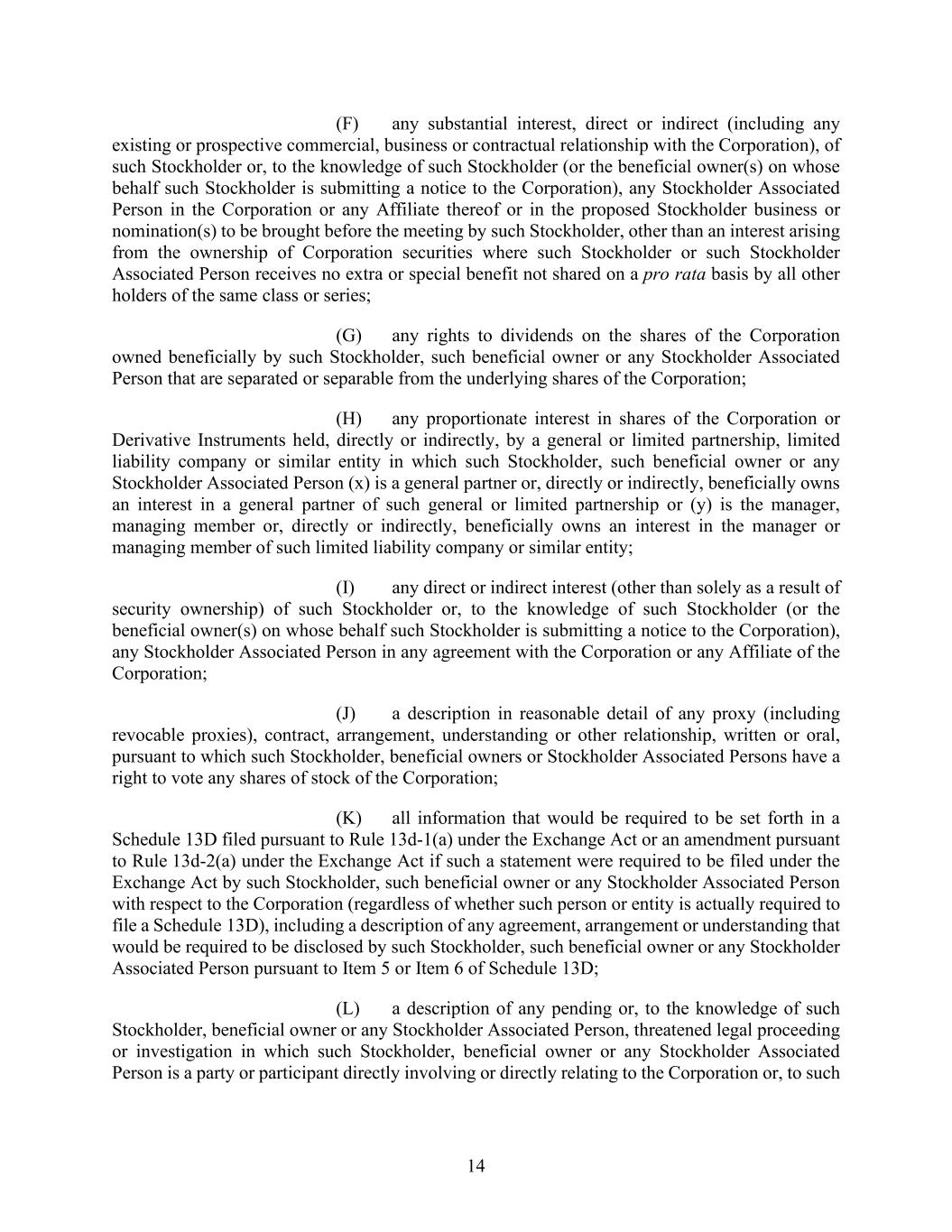 14 (F) any substantial interest, direct or indirect (including any existing or prospective commercial, business or contractual relationship with the Corporation), of such Stockholder or, to the knowledge of such Stockholder (or the beneficial owner(s) on whose behalf such Stockholder is submitting a notice to the Corporation), any Stockholder Associated Person in the Corporation or any Affiliate thereof or in the proposed Stockholder business or nomination(s) to be brought before the meeting by such Stockholder, other than an interest arising from the ownership of Corporation securities where such Stockholder or such Stockholder Associated Person receives no extra or special benefit not shared on a pro rata basis by all other holders of the same class or series; (G) any rights to dividends on the shares of the Corporation owned beneficially by such Stockholder, such beneficial owner or any Stockholder Associated Person that are separated or separable from the underlying shares of the Corporation; (H) any proportionate interest in shares of the Corporation or Derivative Instruments held, directly or indirectly, by a general or limited partnership, limited liability company or similar entity in which such Stockholder, such beneficial owner or any Stockholder Associated Person (x) is a general partner or, directly or indirectly, beneficially owns an interest in a general partner of such general or limited partnership or (y) is the manager, managing member or, directly or indirectly, beneficially owns an interest in the manager or managing member of such limited liability company or similar entity; (I) any direct or indirect interest (other than solely as a result of security ownership) of such Stockholder or, to the knowledge of such Stockholder (or the beneficial owner(s) on whose behalf such Stockholder is submitting a notice to the Corporation), any Stockholder Associated Person in any agreement with the Corporation or any Affiliate of the Corporation; (J) a description in reasonable detail of any proxy (including revocable proxies), contract, arrangement, understanding or other relationship, written or oral, pursuant to which such Stockholder, beneficial owners or Stockholder Associated Persons have a right to vote any shares of stock of the Corporation; (K) all information that would be required to be set forth in a Schedule 13D filed pursuant to Rule 13d-1(a) under the Exchange Act or an amendment pursuant to Rule 13d-2(a) under the Exchange Act if such a statement were required to be filed under the Exchange Act by such Stockholder, such beneficial owner or any Stockholder Associated Person with respect to the Corporation (regardless of whether such person or entity is actually required to file a Schedule 13D), including a description of any agreement, arrangement or understanding that would be required to be disclosed by such Stockholder, such beneficial owner or any Stockholder Associated Person pursuant to Item 5 or Item 6 of Schedule 13D; (L) a description of any pending or, to the knowledge of such Stockholder, beneficial owner or any Stockholder Associated Person, threatened legal proceeding or investigation in which such Stockholder, beneficial owner or any Stockholder Associated Person is a party or participant directly involving or directly relating to the Corporation or, to such