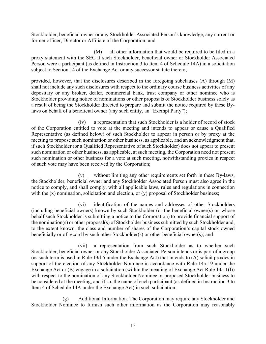 15 Stockholder, beneficial owner or any Stockholder Associated Person’s knowledge, any current or former officer, Director or Affiliate of the Corporation; and (M) all other information that would be required to be filed in a proxy statement with the SEC if such Stockholder, beneficial owner or Stockholder Associated Person were a participant (as defined in Instruction 3 to Item 4 of Schedule 14A) in a solicitation subject to Section 14 of the Exchange Act or any successor statute thereto; provided, however, that the disclosures described in the foregoing subclauses (A) through (M) shall not include any such disclosures with respect to the ordinary course business activities of any depositary or any broker, dealer, commercial bank, trust company or other nominee who is Stockholder providing notice of nominations or other proposals of Stockholder business solely as a result of being the Stockholder directed to prepare and submit the notice required by these By- laws on behalf of a beneficial owner (any such entity, an “Exempt Party”); (iv) a representation that such Stockholder is a holder of record of stock of the Corporation entitled to vote at the meeting and intends to appear or cause a Qualified Representative (as defined below) of such Stockholder to appear in person or by proxy at the meeting to propose such nomination or other business, as applicable, and an acknowledgment that, if such Stockholder (or a Qualified Representative of such Stockholder) does not appear to present such nomination or other business, as applicable, at such meeting, the Corporation need not present such nomination or other business for a vote at such meeting, notwithstanding proxies in respect of such vote may have been received by the Corporation; (v) without limiting any other requirements set forth in these By-laws, the Stockholder, beneficial owner and any Stockholder Associated Person must also agree in the notice to comply, and shall comply, with all applicable laws, rules and regulations in connection with the (x) nomination, solicitation and election, or (y) proposal of Stockholder business; (vi) identification of the names and addresses of other Stockholders (including beneficial owners) known by such Stockholder (or the beneficial owner(s) on whose behalf such Stockholder is submitting a notice to the Corporation) to provide financial support of the nomination(s) or other proposal(s) of Stockholder business submitted by such Stockholder and, to the extent known, the class and number of shares of the Corporation’s capital stock owned beneficially or of record by such other Stockholder(s) or other beneficial owner(s); and (vii) a representation from such Stockholder as to whether such Stockholder, beneficial owner or any Stockholder Associated Person intends or is part of a group (as such term is used in Rule 13d-5 under the Exchange Act) that intends to (A) solicit proxies in support of the election of any Stockholder Nominee in accordance with Rule 14a-19 under the Exchange Act or (B) engage in a solicitation (within the meaning of Exchange Act Rule 14a-1(l)) with respect to the nomination of any Stockholder Nominee or proposed Stockholder business to be considered at the meeting, and if so, the name of each participant (as defined in Instruction 3 to Item 4 of Schedule 14A under the Exchange Act) in such solicitation; (g) Additional Information. The Corporation may require any Stockholder and Stockholder Nominee to furnish such other information as the Corporation may reasonably