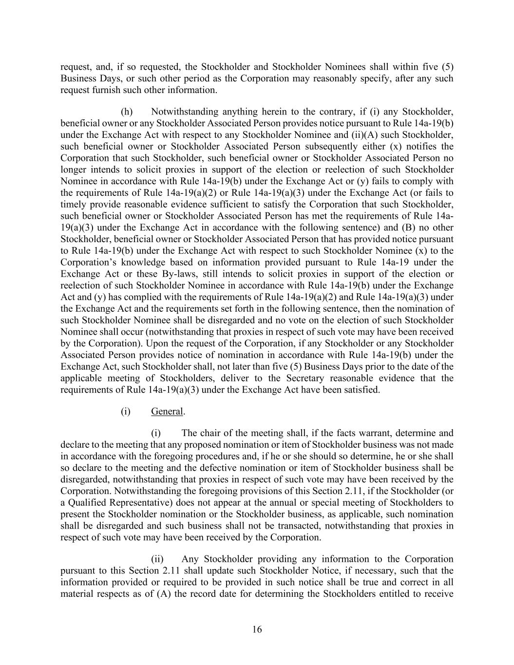 16 request, and, if so requested, the Stockholder and Stockholder Nominees shall within five (5) Business Days, or such other period as the Corporation may reasonably specify, after any such request furnish such other information. (h) Notwithstanding anything herein to the contrary, if (i) any Stockholder, beneficial owner or any Stockholder Associated Person provides notice pursuant to Rule 14a-19(b) under the Exchange Act with respect to any Stockholder Nominee and (ii)(A) such Stockholder, such beneficial owner or Stockholder Associated Person subsequently either (x) notifies the Corporation that such Stockholder, such beneficial owner or Stockholder Associated Person no longer intends to solicit proxies in support of the election or reelection of such Stockholder Nominee in accordance with Rule 14a-19(b) under the Exchange Act or (y) fails to comply with the requirements of Rule 14a-19(a)(2) or Rule 14a-19(a)(3) under the Exchange Act (or fails to timely provide reasonable evidence sufficient to satisfy the Corporation that such Stockholder, such beneficial owner or Stockholder Associated Person has met the requirements of Rule 14a- 19(a)(3) under the Exchange Act in accordance with the following sentence) and (B) no other Stockholder, beneficial owner or Stockholder Associated Person that has provided notice pursuant to Rule 14a-19(b) under the Exchange Act with respect to such Stockholder Nominee (x) to the Corporation’s knowledge based on information provided pursuant to Rule 14a-19 under the Exchange Act or these By-laws, still intends to solicit proxies in support of the election or reelection of such Stockholder Nominee in accordance with Rule 14a-19(b) under the Exchange Act and (y) has complied with the requirements of Rule 14a-19(a)(2) and Rule 14a-19(a)(3) under the Exchange Act and the requirements set forth in the following sentence, then the nomination of such Stockholder Nominee shall be disregarded and no vote on the election of such Stockholder Nominee shall occur (notwithstanding that proxies in respect of such vote may have been received by the Corporation). Upon the request of the Corporation, if any Stockholder or any Stockholder Associated Person provides notice of nomination in accordance with Rule 14a-19(b) under the Exchange Act, such Stockholder shall, not later than five (5) Business Days prior to the date of the applicable meeting of Stockholders, deliver to the Secretary reasonable evidence that the requirements of Rule 14a-19(a)(3) under the Exchange Act have been satisfied. (i) General. (i) The chair of the meeting shall, if the facts warrant, determine and declare to the meeting that any proposed nomination or item of Stockholder business was not made in accordance with the foregoing procedures and, if he or she should so determine, he or she shall so declare to the meeting and the defective nomination or item of Stockholder business shall be disregarded, notwithstanding that proxies in respect of such vote may have been received by the Corporation. Notwithstanding the foregoing provisions of this Section 2.11, if the Stockholder (or a Qualified Representative) does not appear at the annual or special meeting of Stockholders to present the Stockholder nomination or the Stockholder business, as applicable, such nomination shall be disregarded and such business shall not be transacted, notwithstanding that proxies in respect of such vote may have been received by the Corporation. (ii) Any Stockholder providing any information to the Corporation pursuant to this Section 2.11 shall update such Stockholder Notice, if necessary, such that the information provided or required to be provided in such notice shall be true and correct in all material respects as of (A) the record date for determining the Stockholders entitled to receive