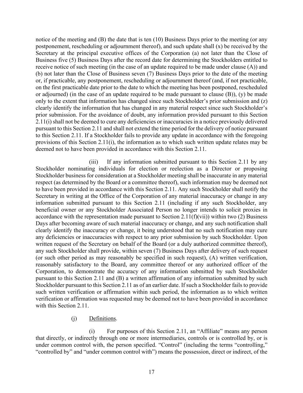 17 notice of the meeting and (B) the date that is ten (10) Business Days prior to the meeting (or any postponement, rescheduling or adjournment thereof), and such update shall (x) be received by the Secretary at the principal executive offices of the Corporation (a) not later than the Close of Business five (5) Business Days after the record date for determining the Stockholders entitled to receive notice of such meeting (in the case of an update required to be made under clause (A)) and (b) not later than the Close of Business seven (7) Business Days prior to the date of the meeting or, if practicable, any postponement, rescheduling or adjournment thereof (and, if not practicable, on the first practicable date prior to the date to which the meeting has been postponed, rescheduled or adjourned) (in the case of an update required to be made pursuant to clause (B)), (y) be made only to the extent that information has changed since such Stockholder’s prior submission and (z) clearly identify the information that has changed in any material respect since such Stockholder’s prior submission. For the avoidance of doubt, any information provided pursuant to this Section 2.11(i) shall not be deemed to cure any deficiencies or inaccuracies in a notice previously delivered pursuant to this Section 2.11 and shall not extend the time period for the delivery of notice pursuant to this Section 2.11. If a Stockholder fails to provide any update in accordance with the foregoing provisions of this Section 2.11(i), the information as to which such written update relates may be deemed not to have been provided in accordance with this Section 2.11. (iii) If any information submitted pursuant to this Section 2.11 by any Stockholder nominating individuals for election or reelection as a Director or proposing Stockholder business for consideration at a Stockholder meeting shall be inaccurate in any material respect (as determined by the Board or a committee thereof), such information may be deemed not to have been provided in accordance with this Section 2.11. Any such Stockholder shall notify the Secretary in writing at the Office of the Corporation of any material inaccuracy or change in any information submitted pursuant to this Section 2.11 (including if any such Stockholder, any beneficial owner or any Stockholder Associated Person no longer intends to solicit proxies in accordance with the representation made pursuant to Section 2.11(f)(vii)) within two (2) Business Days after becoming aware of such material inaccuracy or change, and any such notification shall clearly identify the inaccuracy or change, it being understood that no such notification may cure any deficiencies or inaccuracies with respect to any prior submission by such Stockholder. Upon written request of the Secretary on behalf of the Board (or a duly authorized committee thereof), any such Stockholder shall provide, within seven (7) Business Days after delivery of such request (or such other period as may reasonably be specified in such request), (A) written verification, reasonably satisfactory to the Board, any committee thereof or any authorized officer of the Corporation, to demonstrate the accuracy of any information submitted by such Stockholder pursuant to this Section 2.11 and (B) a written affirmation of any information submitted by such Stockholder pursuant to this Section 2.11 as of an earlier date. If such a Stockholder fails to provide such written verification or affirmation within such period, the information as to which written verification or affirmation was requested may be deemed not to have been provided in accordance with this Section 2.11. (j) Definitions. (i) For purposes of this Section 2.11, an “Affiliate” means any person that directly, or indirectly through one or more intermediaries, controls or is controlled by, or is under common control with, the person specified. “Control” (including the terms “controlling,” “controlled by” and “under common control with”) means the possession, direct or indirect, of the