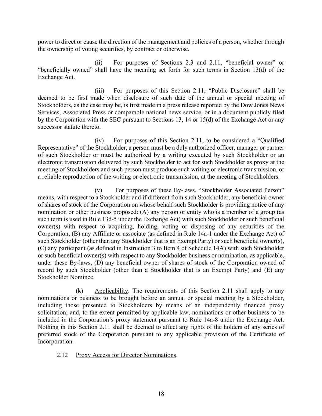18 power to direct or cause the direction of the management and policies of a person, whether through the ownership of voting securities, by contract or otherwise. (ii) For purposes of Sections 2.3 and 2.11, “beneficial owner” or “beneficially owned” shall have the meaning set forth for such terms in Section 13(d) of the Exchange Act. (iii) For purposes of this Section 2.11, “Public Disclosure” shall be deemed to be first made when disclosure of such date of the annual or special meeting of Stockholders, as the case may be, is first made in a press release reported by the Dow Jones News Services, Associated Press or comparable national news service, or in a document publicly filed by the Corporation with the SEC pursuant to Sections 13, 14 or 15(d) of the Exchange Act or any successor statute thereto. (iv) For purposes of this Section 2.11, to be considered a “Qualified Representative” of the Stockholder, a person must be a duly authorized officer, manager or partner of such Stockholder or must be authorized by a writing executed by such Stockholder or an electronic transmission delivered by such Stockholder to act for such Stockholder as proxy at the meeting of Stockholders and such person must produce such writing or electronic transmission, or a reliable reproduction of the writing or electronic transmission, at the meeting of Stockholders. (v) For purposes of these By-laws, “Stockholder Associated Person” means, with respect to a Stockholder and if different from such Stockholder, any beneficial owner of shares of stock of the Corporation on whose behalf such Stockholder is providing notice of any nomination or other business proposed: (A) any person or entity who is a member of a group (as such term is used in Rule 13d-5 under the Exchange Act) with such Stockholder or such beneficial owner(s) with respect to acquiring, holding, voting or disposing of any securities of the Corporation, (B) any Affiliate or associate (as defined in Rule 14a-1 under the Exchange Act) of such Stockholder (other than any Stockholder that is an Exempt Party) or such beneficial owner(s), (C) any participant (as defined in Instruction 3 to Item 4 of Schedule 14A) with such Stockholder or such beneficial owner(s) with respect to any Stockholder business or nomination, as applicable, under these By-laws, (D) any beneficial owner of shares of stock of the Corporation owned of record by such Stockholder (other than a Stockholder that is an Exempt Party) and (E) any Stockholder Nominee. (k) Applicability. The requirements of this Section 2.11 shall apply to any nominations or business to be brought before an annual or special meeting by a Stockholder, including those presented to Stockholders by means of an independently financed proxy solicitation; and, to the extent permitted by applicable law, nominations or other business to be included in the Corporation’s proxy statement pursuant to Rule 14a-8 under the Exchange Act. Nothing in this Section 2.11 shall be deemed to affect any rights of the holders of any series of preferred stock of the Corporation pursuant to any applicable provision of the Certificate of Incorporation. 2.12 Proxy Access for Director Nominations.