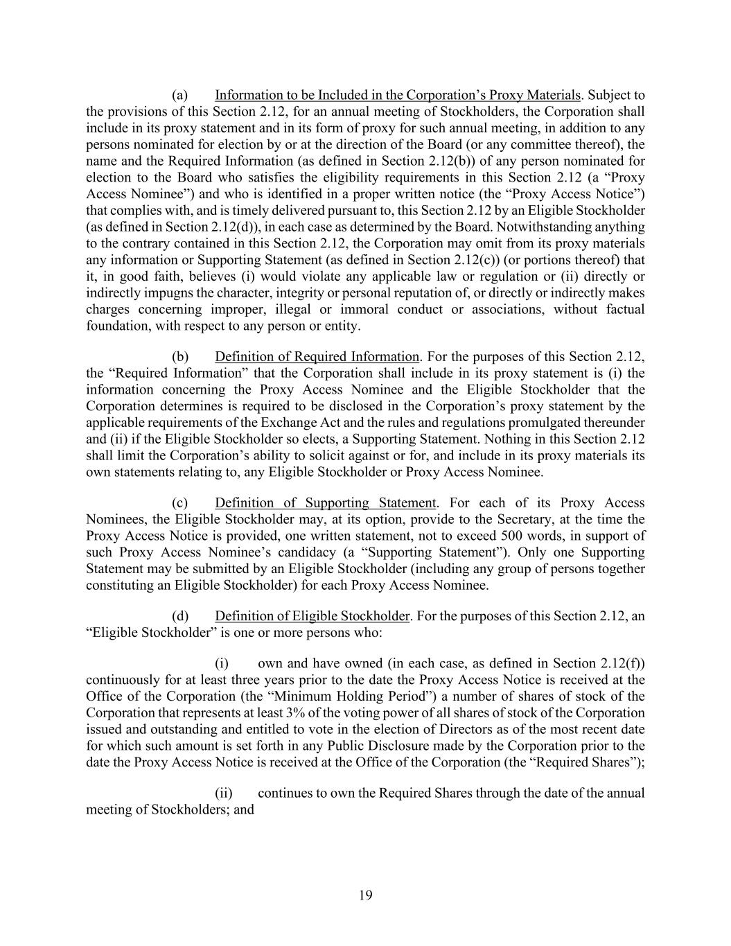 19 (a) Information to be Included in the Corporation’s Proxy Materials. Subject to the provisions of this Section 2.12, for an annual meeting of Stockholders, the Corporation shall include in its proxy statement and in its form of proxy for such annual meeting, in addition to any persons nominated for election by or at the direction of the Board (or any committee thereof), the name and the Required Information (as defined in Section 2.12(b)) of any person nominated for election to the Board who satisfies the eligibility requirements in this Section 2.12 (a “Proxy Access Nominee”) and who is identified in a proper written notice (the “Proxy Access Notice”) that complies with, and is timely delivered pursuant to, this Section 2.12 by an Eligible Stockholder (as defined in Section 2.12(d)), in each case as determined by the Board. Notwithstanding anything to the contrary contained in this Section 2.12, the Corporation may omit from its proxy materials any information or Supporting Statement (as defined in Section 2.12(c)) (or portions thereof) that it, in good faith, believes (i) would violate any applicable law or regulation or (ii) directly or indirectly impugns the character, integrity or personal reputation of, or directly or indirectly makes charges concerning improper, illegal or immoral conduct or associations, without factual foundation, with respect to any person or entity. (b) Definition of Required Information. For the purposes of this Section 2.12, the “Required Information” that the Corporation shall include in its proxy statement is (i) the information concerning the Proxy Access Nominee and the Eligible Stockholder that the Corporation determines is required to be disclosed in the Corporation’s proxy statement by the applicable requirements of the Exchange Act and the rules and regulations promulgated thereunder and (ii) if the Eligible Stockholder so elects, a Supporting Statement. Nothing in this Section 2.12 shall limit the Corporation’s ability to solicit against or for, and include in its proxy materials its own statements relating to, any Eligible Stockholder or Proxy Access Nominee. (c) Definition of Supporting Statement. For each of its Proxy Access Nominees, the Eligible Stockholder may, at its option, provide to the Secretary, at the time the Proxy Access Notice is provided, one written statement, not to exceed 500 words, in support of such Proxy Access Nominee’s candidacy (a “Supporting Statement”). Only one Supporting Statement may be submitted by an Eligible Stockholder (including any group of persons together constituting an Eligible Stockholder) for each Proxy Access Nominee. (d) Definition of Eligible Stockholder. For the purposes of this Section 2.12, an “Eligible Stockholder” is one or more persons who: (i) own and have owned (in each case, as defined in Section 2.12(f)) continuously for at least three years prior to the date the Proxy Access Notice is received at the Office of the Corporation (the “Minimum Holding Period”) a number of shares of stock of the Corporation that represents at least 3% of the voting power of all shares of stock of the Corporation issued and outstanding and entitled to vote in the election of Directors as of the most recent date for which such amount is set forth in any Public Disclosure made by the Corporation prior to the date the Proxy Access Notice is received at the Office of the Corporation (the “Required Shares”); (ii) continues to own the Required Shares through the date of the annual meeting of Stockholders; and