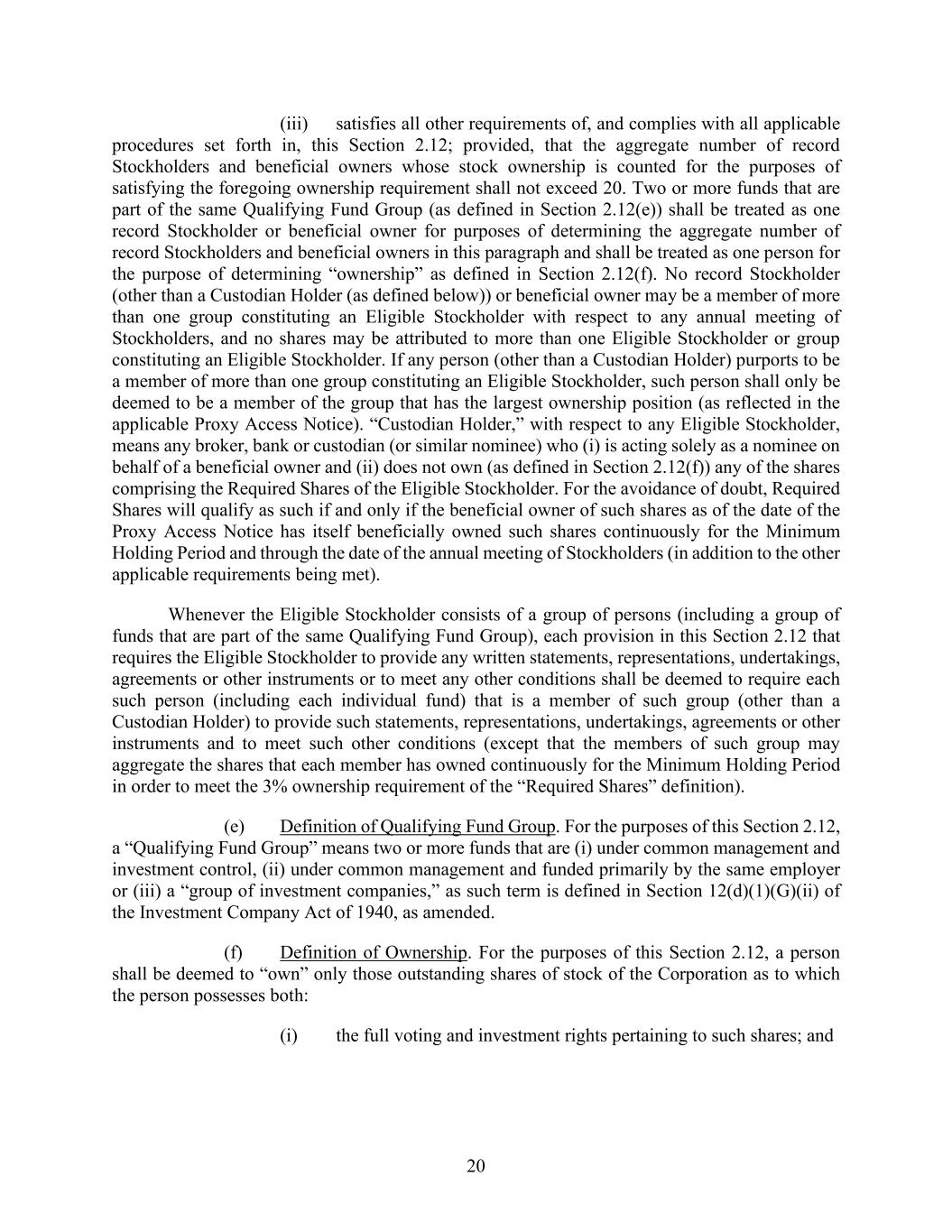20 (iii) satisfies all other requirements of, and complies with all applicable procedures set forth in, this Section 2.12; provided, that the aggregate number of record Stockholders and beneficial owners whose stock ownership is counted for the purposes of satisfying the foregoing ownership requirement shall not exceed 20. Two or more funds that are part of the same Qualifying Fund Group (as defined in Section 2.12(e)) shall be treated as one record Stockholder or beneficial owner for purposes of determining the aggregate number of record Stockholders and beneficial owners in this paragraph and shall be treated as one person for the purpose of determining “ownership” as defined in Section 2.12(f). No record Stockholder (other than a Custodian Holder (as defined below)) or beneficial owner may be a member of more than one group constituting an Eligible Stockholder with respect to any annual meeting of Stockholders, and no shares may be attributed to more than one Eligible Stockholder or group constituting an Eligible Stockholder. If any person (other than a Custodian Holder) purports to be a member of more than one group constituting an Eligible Stockholder, such person shall only be deemed to be a member of the group that has the largest ownership position (as reflected in the applicable Proxy Access Notice). “Custodian Holder,” with respect to any Eligible Stockholder, means any broker, bank or custodian (or similar nominee) who (i) is acting solely as a nominee on behalf of a beneficial owner and (ii) does not own (as defined in Section 2.12(f)) any of the shares comprising the Required Shares of the Eligible Stockholder. For the avoidance of doubt, Required Shares will qualify as such if and only if the beneficial owner of such shares as of the date of the Proxy Access Notice has itself beneficially owned such shares continuously for the Minimum Holding Period and through the date of the annual meeting of Stockholders (in addition to the other applicable requirements being met). Whenever the Eligible Stockholder consists of a group of persons (including a group of funds that are part of the same Qualifying Fund Group), each provision in this Section 2.12 that requires the Eligible Stockholder to provide any written statements, representations, undertakings, agreements or other instruments or to meet any other conditions shall be deemed to require each such person (including each individual fund) that is a member of such group (other than a Custodian Holder) to provide such statements, representations, undertakings, agreements or other instruments and to meet such other conditions (except that the members of such group may aggregate the shares that each member has owned continuously for the Minimum Holding Period in order to meet the 3% ownership requirement of the “Required Shares” definition). (e) Definition of Qualifying Fund Group. For the purposes of this Section 2.12, a “Qualifying Fund Group” means two or more funds that are (i) under common management and investment control, (ii) under common management and funded primarily by the same employer or (iii) a “group of investment companies,” as such term is defined in Section 12(d)(1)(G)(ii) of the Investment Company Act of 1940, as amended. (f) Definition of Ownership. For the purposes of this Section 2.12, a person shall be deemed to “own” only those outstanding shares of stock of the Corporation as to which the person possesses both: (i) the full voting and investment rights pertaining to such shares; and