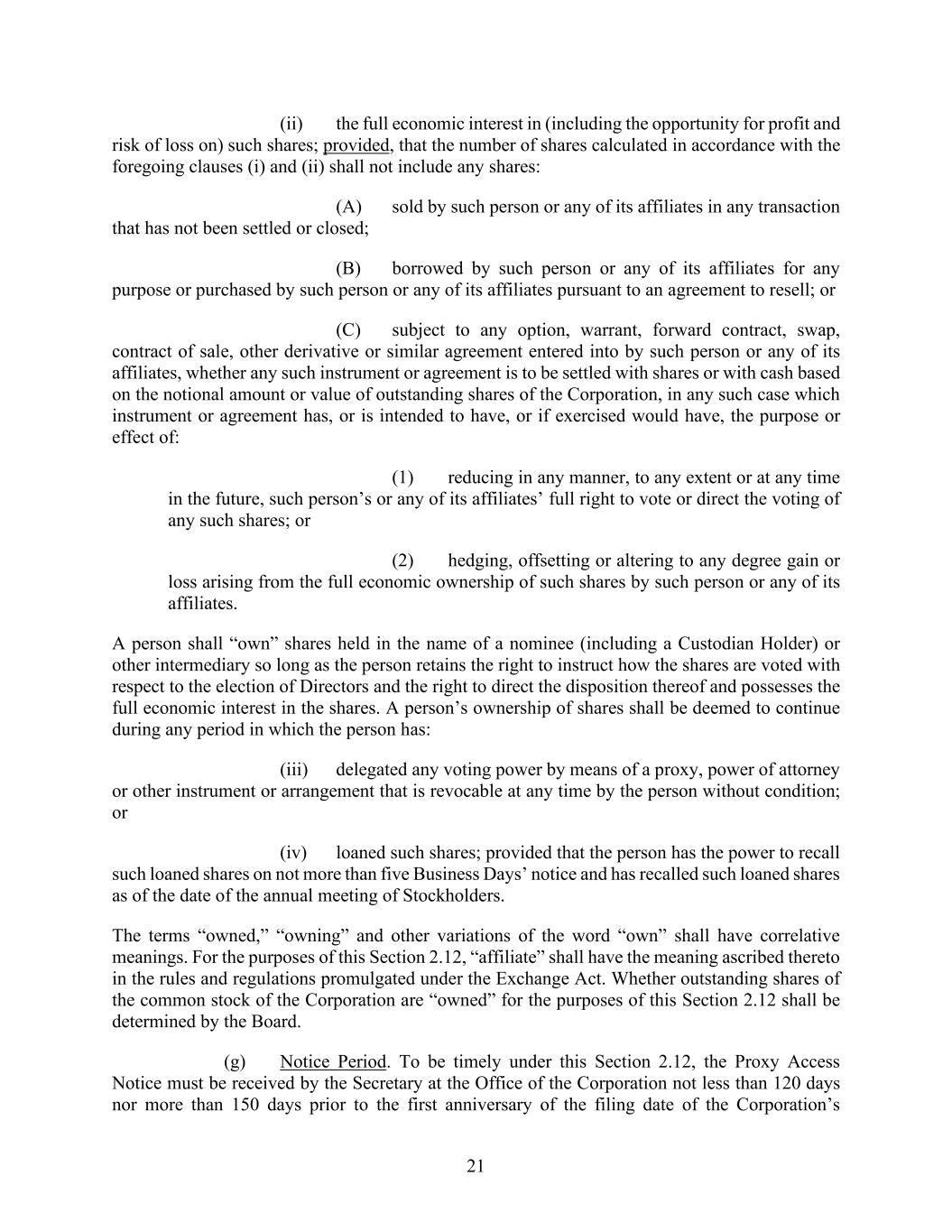 21 (ii) the full economic interest in (including the opportunity for profit and risk of loss on) such shares; provided, that the number of shares calculated in accordance with the foregoing clauses (i) and (ii) shall not include any shares: (A) sold by such person or any of its affiliates in any transaction that has not been settled or closed; (B) borrowed by such person or any of its affiliates for any purpose or purchased by such person or any of its affiliates pursuant to an agreement to resell; or (C) subject to any option, warrant, forward contract, swap, contract of sale, other derivative or similar agreement entered into by such person or any of its affiliates, whether any such instrument or agreement is to be settled with shares or with cash based on the notional amount or value of outstanding shares of the Corporation, in any such case which instrument or agreement has, or is intended to have, or if exercised would have, the purpose or effect of: (1) reducing in any manner, to any extent or at any time in the future, such person’s or any of its affiliates’ full right to vote or direct the voting of any such shares; or (2) hedging, offsetting or altering to any degree gain or loss arising from the full economic ownership of such shares by such person or any of its affiliates. A person shall “own” shares held in the name of a nominee (including a Custodian Holder) or other intermediary so long as the person retains the right to instruct how the shares are voted with respect to the election of Directors and the right to direct the disposition thereof and possesses the full economic interest in the shares. A person’s ownership of shares shall be deemed to continue during any period in which the person has: (iii) delegated any voting power by means of a proxy, power of attorney or other instrument or arrangement that is revocable at any time by the person without condition; or (iv) loaned such shares; provided that the person has the power to recall such loaned shares on not more than five Business Days’ notice and has recalled such loaned shares as of the date of the annual meeting of Stockholders. The terms “owned,” “owning” and other variations of the word “own” shall have correlative meanings. For the purposes of this Section 2.12, “affiliate” shall have the meaning ascribed thereto in the rules and regulations promulgated under the Exchange Act. Whether outstanding shares of the common stock of the Corporation are “owned” for the purposes of this Section 2.12 shall be determined by the Board. (g) Notice Period. To be timely under this Section 2.12, the Proxy Access Notice must be received by the Secretary at the Office of the Corporation not less than 120 days nor more than 150 days prior to the first anniversary of the filing date of the Corporation’s
