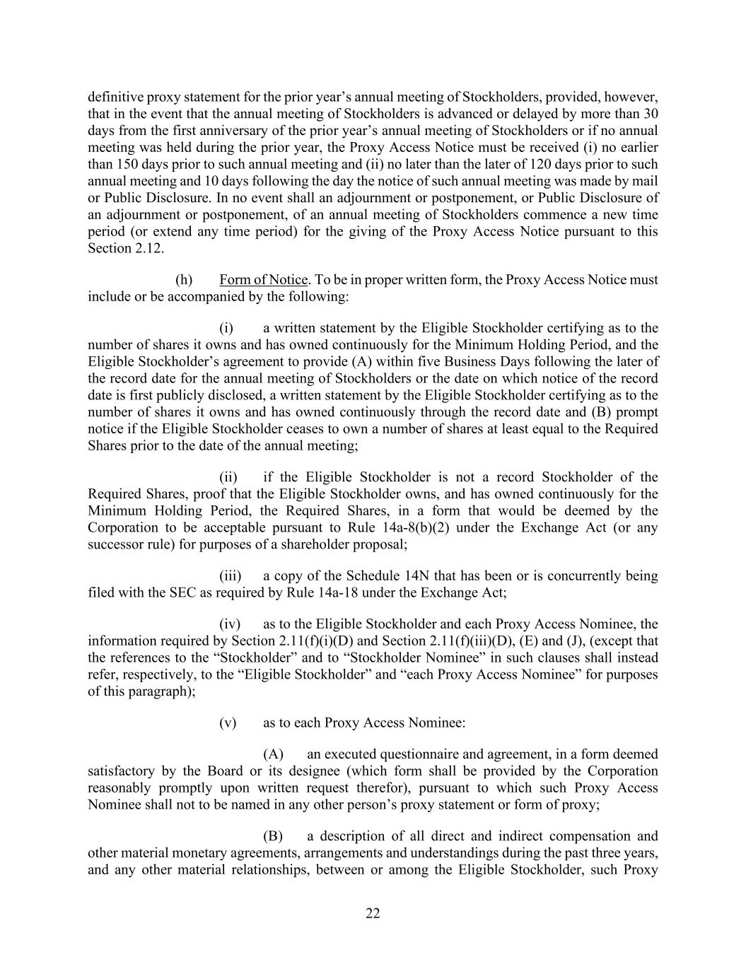 22 definitive proxy statement for the prior year’s annual meeting of Stockholders, provided, however, that in the event that the annual meeting of Stockholders is advanced or delayed by more than 30 days from the first anniversary of the prior year’s annual meeting of Stockholders or if no annual meeting was held during the prior year, the Proxy Access Notice must be received (i) no earlier than 150 days prior to such annual meeting and (ii) no later than the later of 120 days prior to such annual meeting and 10 days following the day the notice of such annual meeting was made by mail or Public Disclosure. In no event shall an adjournment or postponement, or Public Disclosure of an adjournment or postponement, of an annual meeting of Stockholders commence a new time period (or extend any time period) for the giving of the Proxy Access Notice pursuant to this Section 2.12. (h) Form of Notice. To be in proper written form, the Proxy Access Notice must include or be accompanied by the following: (i) a written statement by the Eligible Stockholder certifying as to the number of shares it owns and has owned continuously for the Minimum Holding Period, and the Eligible Stockholder’s agreement to provide (A) within five Business Days following the later of the record date for the annual meeting of Stockholders or the date on which notice of the record date is first publicly disclosed, a written statement by the Eligible Stockholder certifying as to the number of shares it owns and has owned continuously through the record date and (B) prompt notice if the Eligible Stockholder ceases to own a number of shares at least equal to the Required Shares prior to the date of the annual meeting; (ii) if the Eligible Stockholder is not a record Stockholder of the Required Shares, proof that the Eligible Stockholder owns, and has owned continuously for the Minimum Holding Period, the Required Shares, in a form that would be deemed by the Corporation to be acceptable pursuant to Rule 14a-8(b)(2) under the Exchange Act (or any successor rule) for purposes of a shareholder proposal; (iii) a copy of the Schedule 14N that has been or is concurrently being filed with the SEC as required by Rule 14a-18 under the Exchange Act; (iv) as to the Eligible Stockholder and each Proxy Access Nominee, the information required by Section 2.11(f)(i)(D) and Section 2.11(f)(iii)(D), (E) and (J), (except that the references to the “Stockholder” and to “Stockholder Nominee” in such clauses shall instead refer, respectively, to the “Eligible Stockholder” and “each Proxy Access Nominee” for purposes of this paragraph); (v) as to each Proxy Access Nominee: (A) an executed questionnaire and agreement, in a form deemed satisfactory by the Board or its designee (which form shall be provided by the Corporation reasonably promptly upon written request therefor), pursuant to which such Proxy Access Nominee shall not to be named in any other person’s proxy statement or form of proxy; (B) a description of all direct and indirect compensation and other material monetary agreements, arrangements and understandings during the past three years, and any other material relationships, between or among the Eligible Stockholder, such Proxy