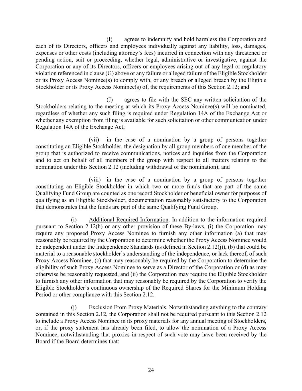 24 (I) agrees to indemnify and hold harmless the Corporation and each of its Directors, officers and employees individually against any liability, loss, damages, expenses or other costs (including attorney’s fees) incurred in connection with any threatened or pending action, suit or proceeding, whether legal, administrative or investigative, against the Corporation or any of its Directors, officers or employees arising out of any legal or regulatory violation referenced in clause (G) above or any failure or alleged failure of the Eligible Stockholder or its Proxy Access Nominee(s) to comply with, or any breach or alleged breach by the Eligible Stockholder or its Proxy Access Nominee(s) of, the requirements of this Section 2.12; and (J) agrees to file with the SEC any written solicitation of the Stockholders relating to the meeting at which its Proxy Access Nominee(s) will be nominated, regardless of whether any such filing is required under Regulation 14A of the Exchange Act or whether any exemption from filing is available for such solicitation or other communication under Regulation 14A of the Exchange Act; (vii) in the case of a nomination by a group of persons together constituting an Eligible Stockholder, the designation by all group members of one member of the group that is authorized to receive communications, notices and inquiries from the Corporation and to act on behalf of all members of the group with respect to all matters relating to the nomination under this Section 2.12 (including withdrawal of the nomination); and (viii) in the case of a nomination by a group of persons together constituting an Eligible Stockholder in which two or more funds that are part of the same Qualifying Fund Group are counted as one record Stockholder or beneficial owner for purposes of qualifying as an Eligible Stockholder, documentation reasonably satisfactory to the Corporation that demonstrates that the funds are part of the same Qualifying Fund Group. (i) Additional Required Information. In addition to the information required pursuant to Section 2.12(h) or any other provision of these By-laws, (i) the Corporation may require any proposed Proxy Access Nominee to furnish any other information (a) that may reasonably be required by the Corporation to determine whether the Proxy Access Nominee would be independent under the Independence Standards (as defined in Section 2.12(j)), (b) that could be material to a reasonable stockholder’s understanding of the independence, or lack thereof, of such Proxy Access Nominee, (c) that may reasonably be required by the Corporation to determine the eligibility of such Proxy Access Nominee to serve as a Director of the Corporation or (d) as may otherwise be reasonably requested, and (ii) the Corporation may require the Eligible Stockholder to furnish any other information that may reasonably be required by the Corporation to verify the Eligible Stockholder’s continuous ownership of the Required Shares for the Minimum Holding Period or other compliance with this Section 2.12. (j) Exclusion From Proxy Materials. Notwithstanding anything to the contrary contained in this Section 2.12, the Corporation shall not be required pursuant to this Section 2.12 to include a Proxy Access Nominee in its proxy materials for any annual meeting of Stockholders, or, if the proxy statement has already been filed, to allow the nomination of a Proxy Access Nominee, notwithstanding that proxies in respect of such vote may have been received by the Board if the Board determines that: