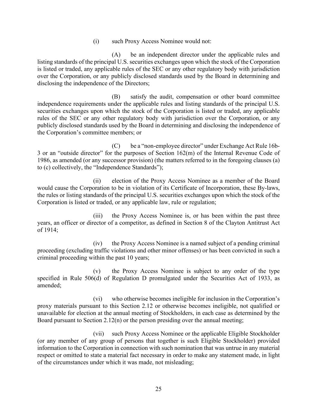 25 (i) such Proxy Access Nominee would not: (A) be an independent director under the applicable rules and listing standards of the principal U.S. securities exchanges upon which the stock of the Corporation is listed or traded, any applicable rules of the SEC or any other regulatory body with jurisdiction over the Corporation, or any publicly disclosed standards used by the Board in determining and disclosing the independence of the Directors; (B) satisfy the audit, compensation or other board committee independence requirements under the applicable rules and listing standards of the principal U.S. securities exchanges upon which the stock of the Corporation is listed or traded, any applicable rules of the SEC or any other regulatory body with jurisdiction over the Corporation, or any publicly disclosed standards used by the Board in determining and disclosing the independence of the Corporation’s committee members; or (C) be a “non-employee director” under Exchange Act Rule 16b- 3 or an “outside director” for the purposes of Section 162(m) of the Internal Revenue Code of 1986, as amended (or any successor provision) (the matters referred to in the foregoing clauses (a) to (c) collectively, the “Independence Standards”); (ii) election of the Proxy Access Nominee as a member of the Board would cause the Corporation to be in violation of its Certificate of Incorporation, these By-laws, the rules or listing standards of the principal U.S. securities exchanges upon which the stock of the Corporation is listed or traded, or any applicable law, rule or regulation; (iii) the Proxy Access Nominee is, or has been within the past three years, an officer or director of a competitor, as defined in Section 8 of the Clayton Antitrust Act of 1914; (iv) the Proxy Access Nominee is a named subject of a pending criminal proceeding (excluding traffic violations and other minor offenses) or has been convicted in such a criminal proceeding within the past 10 years; (v) the Proxy Access Nominee is subject to any order of the type specified in Rule 506(d) of Regulation D promulgated under the Securities Act of 1933, as amended; (vi) who otherwise becomes ineligible for inclusion in the Corporation’s proxy materials pursuant to this Section 2.12 or otherwise becomes ineligible, not qualified or unavailable for election at the annual meeting of Stockholders, in each case as determined by the Board pursuant to Section 2.12(n) or the person presiding over the annual meeting; (vii) such Proxy Access Nominee or the applicable Eligible Stockholder (or any member of any group of persons that together is such Eligible Stockholder) provided information to the Corporation in connection with such nomination that was untrue in any material respect or omitted to state a material fact necessary in order to make any statement made, in light of the circumstances under which it was made, not misleading;