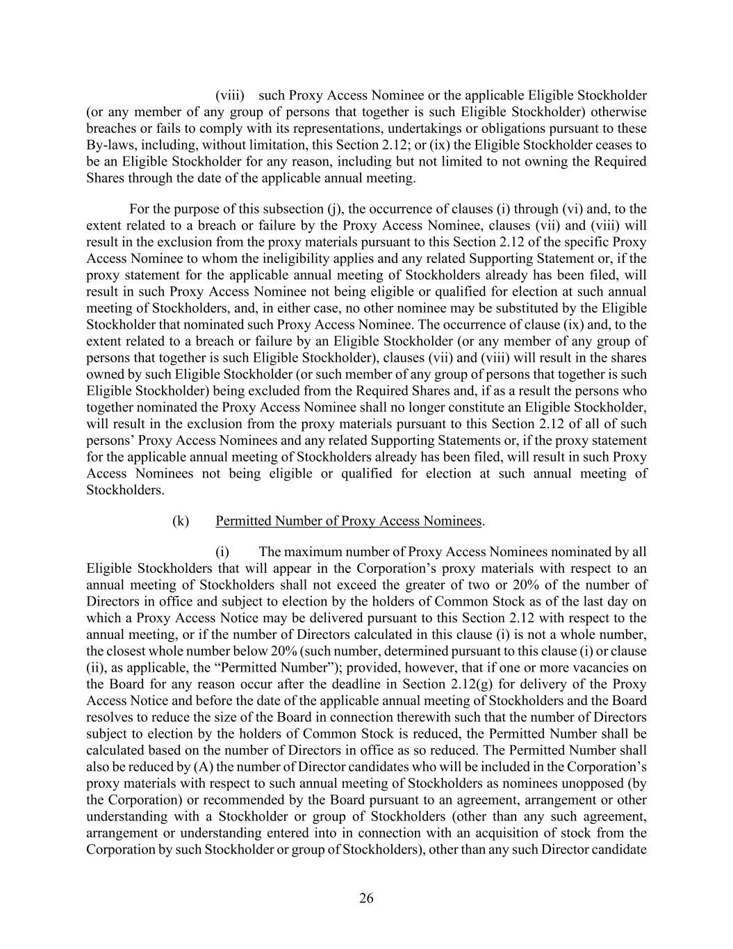 26 (viii) such Proxy Access Nominee or the applicable Eligible Stockholder (or any member of any group of persons that together is such Eligible Stockholder) otherwise breaches or fails to comply with its representations, undertakings or obligations pursuant to these By-laws, including, without limitation, this Section 2.12; or (ix) the Eligible Stockholder ceases to be an Eligible Stockholder for any reason, including but not limited to not owning the Required Shares through the date of the applicable annual meeting. For the purpose of this subsection (j), the occurrence of clauses (i) through (vi) and, to the extent related to a breach or failure by the Proxy Access Nominee, clauses (vii) and (viii) will result in the exclusion from the proxy materials pursuant to this Section 2.12 of the specific Proxy Access Nominee to whom the ineligibility applies and any related Supporting Statement or, if the proxy statement for the applicable annual meeting of Stockholders already has been filed, will result in such Proxy Access Nominee not being eligible or qualified for election at such annual meeting of Stockholders, and, in either case, no other nominee may be substituted by the Eligible Stockholder that nominated such Proxy Access Nominee. The occurrence of clause (ix) and, to the extent related to a breach or failure by an Eligible Stockholder (or any member of any group of persons that together is such Eligible Stockholder), clauses (vii) and (viii) will result in the shares owned by such Eligible Stockholder (or such member of any group of persons that together is such Eligible Stockholder) being excluded from the Required Shares and, if as a result the persons who together nominated the Proxy Access Nominee shall no longer constitute an Eligible Stockholder, will result in the exclusion from the proxy materials pursuant to this Section 2.12 of all of such persons’ Proxy Access Nominees and any related Supporting Statements or, if the proxy statement for the applicable annual meeting of Stockholders already has been filed, will result in such Proxy Access Nominees not being eligible or qualified for election at such annual meeting of Stockholders. (k) Permitted Number of Proxy Access Nominees. (i) The maximum number of Proxy Access Nominees nominated by all Eligible Stockholders that will appear in the Corporation’s proxy materials with respect to an annual meeting of Stockholders shall not exceed the greater of two or 20% of the number of Directors in office and subject to election by the holders of Common Stock as of the last day on which a Proxy Access Notice may be delivered pursuant to this Section 2.12 with respect to the annual meeting, or if the number of Directors calculated in this clause (i) is not a whole number, the closest whole number below 20% (such number, determined pursuant to this clause (i) or clause (ii), as applicable, the “Permitted Number”); provided, however, that if one or more vacancies on the Board for any reason occur after the deadline in Section 2.12(g) for delivery of the Proxy Access Notice and before the date of the applicable annual meeting of Stockholders and the Board resolves to reduce the size of the Board in connection therewith such that the number of Directors subject to election by the holders of Common Stock is reduced, the Permitted Number shall be calculated based on the number of Directors in office as so reduced. The Permitted Number shall also be reduced by (A) the number of Director candidates who will be included in the Corporation’s proxy materials with respect to such annual meeting of Stockholders as nominees unopposed (by the Corporation) or recommended by the Board pursuant to an agreement, arrangement or other understanding with a Stockholder or group of Stockholders (other than any such agreement, arrangement or understanding entered into in connection with an acquisition of stock from the Corporation by such Stockholder or group of Stockholders), other than any such Director candidate
