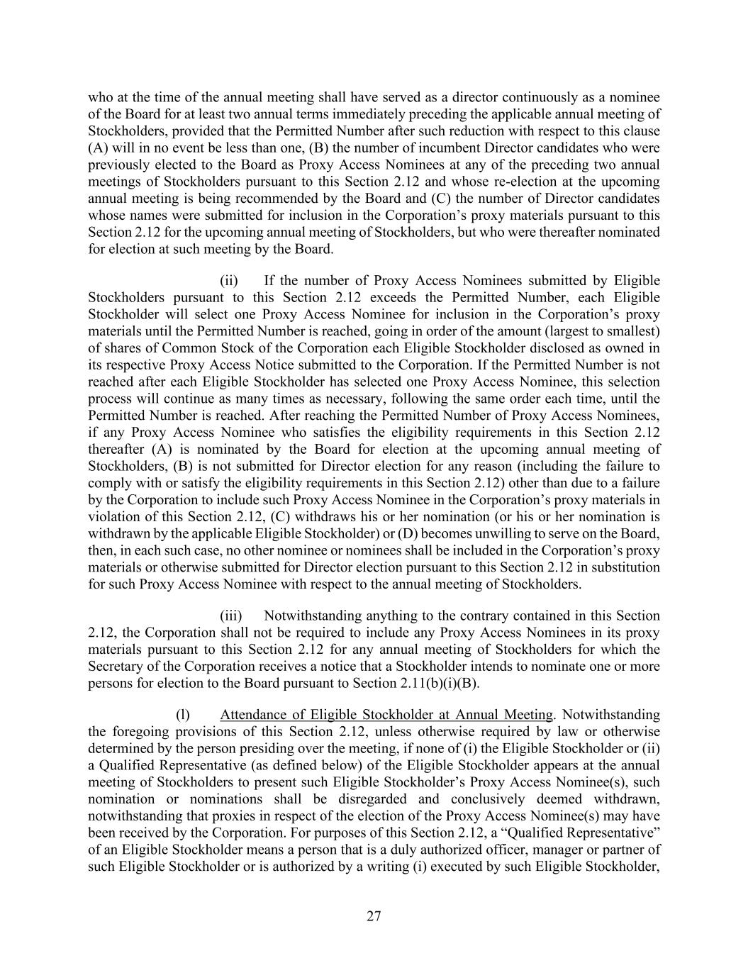 27 who at the time of the annual meeting shall have served as a director continuously as a nominee of the Board for at least two annual terms immediately preceding the applicable annual meeting of Stockholders, provided that the Permitted Number after such reduction with respect to this clause (A) will in no event be less than one, (B) the number of incumbent Director candidates who were previously elected to the Board as Proxy Access Nominees at any of the preceding two annual meetings of Stockholders pursuant to this Section 2.12 and whose re-election at the upcoming annual meeting is being recommended by the Board and (C) the number of Director candidates whose names were submitted for inclusion in the Corporation’s proxy materials pursuant to this Section 2.12 for the upcoming annual meeting of Stockholders, but who were thereafter nominated for election at such meeting by the Board. (ii) If the number of Proxy Access Nominees submitted by Eligible Stockholders pursuant to this Section 2.12 exceeds the Permitted Number, each Eligible Stockholder will select one Proxy Access Nominee for inclusion in the Corporation’s proxy materials until the Permitted Number is reached, going in order of the amount (largest to smallest) of shares of Common Stock of the Corporation each Eligible Stockholder disclosed as owned in its respective Proxy Access Notice submitted to the Corporation. If the Permitted Number is not reached after each Eligible Stockholder has selected one Proxy Access Nominee, this selection process will continue as many times as necessary, following the same order each time, until the Permitted Number is reached. After reaching the Permitted Number of Proxy Access Nominees, if any Proxy Access Nominee who satisfies the eligibility requirements in this Section 2.12 thereafter (A) is nominated by the Board for election at the upcoming annual meeting of Stockholders, (B) is not submitted for Director election for any reason (including the failure to comply with or satisfy the eligibility requirements in this Section 2.12) other than due to a failure by the Corporation to include such Proxy Access Nominee in the Corporation’s proxy materials in violation of this Section 2.12, (C) withdraws his or her nomination (or his or her nomination is withdrawn by the applicable Eligible Stockholder) or (D) becomes unwilling to serve on the Board, then, in each such case, no other nominee or nominees shall be included in the Corporation’s proxy materials or otherwise submitted for Director election pursuant to this Section 2.12 in substitution for such Proxy Access Nominee with respect to the annual meeting of Stockholders. (iii) Notwithstanding anything to the contrary contained in this Section 2.12, the Corporation shall not be required to include any Proxy Access Nominees in its proxy materials pursuant to this Section 2.12 for any annual meeting of Stockholders for which the Secretary of the Corporation receives a notice that a Stockholder intends to nominate one or more persons for election to the Board pursuant to Section 2.11(b)(i)(B). (l) Attendance of Eligible Stockholder at Annual Meeting. Notwithstanding the foregoing provisions of this Section 2.12, unless otherwise required by law or otherwise determined by the person presiding over the meeting, if none of (i) the Eligible Stockholder or (ii) a Qualified Representative (as defined below) of the Eligible Stockholder appears at the annual meeting of Stockholders to present such Eligible Stockholder’s Proxy Access Nominee(s), such nomination or nominations shall be disregarded and conclusively deemed withdrawn, notwithstanding that proxies in respect of the election of the Proxy Access Nominee(s) may have been received by the Corporation. For purposes of this Section 2.12, a “Qualified Representative” of an Eligible Stockholder means a person that is a duly authorized officer, manager or partner of such Eligible Stockholder or is authorized by a writing (i) executed by such Eligible Stockholder,