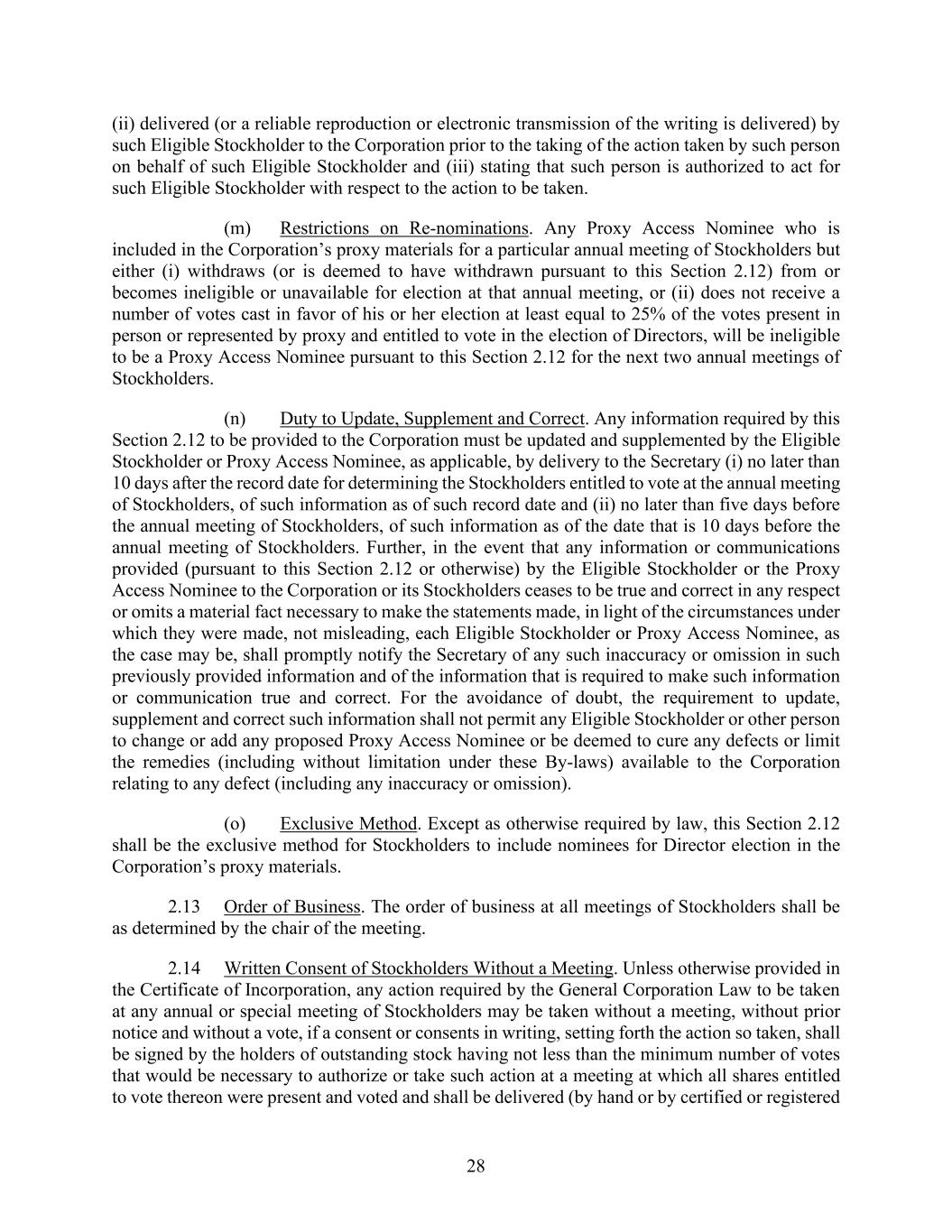 28 (ii) delivered (or a reliable reproduction or electronic transmission of the writing is delivered) by such Eligible Stockholder to the Corporation prior to the taking of the action taken by such person on behalf of such Eligible Stockholder and (iii) stating that such person is authorized to act for such Eligible Stockholder with respect to the action to be taken. (m) Restrictions on Re-nominations. Any Proxy Access Nominee who is included in the Corporation’s proxy materials for a particular annual meeting of Stockholders but either (i) withdraws (or is deemed to have withdrawn pursuant to this Section 2.12) from or becomes ineligible or unavailable for election at that annual meeting, or (ii) does not receive a number of votes cast in favor of his or her election at least equal to 25% of the votes present in person or represented by proxy and entitled to vote in the election of Directors, will be ineligible to be a Proxy Access Nominee pursuant to this Section 2.12 for the next two annual meetings of Stockholders. (n) Duty to Update, Supplement and Correct. Any information required by this Section 2.12 to be provided to the Corporation must be updated and supplemented by the Eligible Stockholder or Proxy Access Nominee, as applicable, by delivery to the Secretary (i) no later than 10 days after the record date for determining the Stockholders entitled to vote at the annual meeting of Stockholders, of such information as of such record date and (ii) no later than five days before the annual meeting of Stockholders, of such information as of the date that is 10 days before the annual meeting of Stockholders. Further, in the event that any information or communications provided (pursuant to this Section 2.12 or otherwise) by the Eligible Stockholder or the Proxy Access Nominee to the Corporation or its Stockholders ceases to be true and correct in any respect or omits a material fact necessary to make the statements made, in light of the circumstances under which they were made, not misleading, each Eligible Stockholder or Proxy Access Nominee, as the case may be, shall promptly notify the Secretary of any such inaccuracy or omission in such previously provided information and of the information that is required to make such information or communication true and correct. For the avoidance of doubt, the requirement to update, supplement and correct such information shall not permit any Eligible Stockholder or other person to change or add any proposed Proxy Access Nominee or be deemed to cure any defects or limit the remedies (including without limitation under these By-laws) available to the Corporation relating to any defect (including any inaccuracy or omission). (o) Exclusive Method. Except as otherwise required by law, this Section 2.12 shall be the exclusive method for Stockholders to include nominees for Director election in the Corporation’s proxy materials. 2.13 Order of Business. The order of business at all meetings of Stockholders shall be as determined by the chair of the meeting. 2.14 Written Consent of Stockholders Without a Meeting. Unless otherwise provided in the Certificate of Incorporation, any action required by the General Corporation Law to be taken at any annual or special meeting of Stockholders may be taken without a meeting, without prior notice and without a vote, if a consent or consents in writing, setting forth the action so taken, shall be signed by the holders of outstanding stock having not less than the minimum number of votes that would be necessary to authorize or take such action at a meeting at which all shares entitled to vote thereon were present and voted and shall be delivered (by hand or by certified or registered
