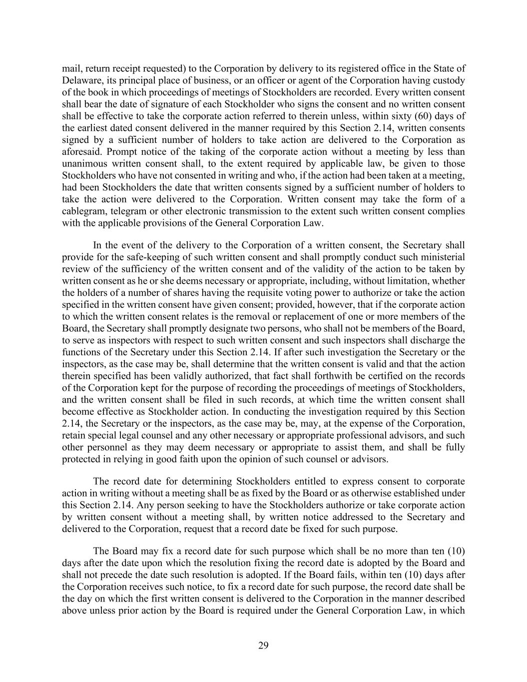 29 mail, return receipt requested) to the Corporation by delivery to its registered office in the State of Delaware, its principal place of business, or an officer or agent of the Corporation having custody of the book in which proceedings of meetings of Stockholders are recorded. Every written consent shall bear the date of signature of each Stockholder who signs the consent and no written consent shall be effective to take the corporate action referred to therein unless, within sixty (60) days of the earliest dated consent delivered in the manner required by this Section 2.14, written consents signed by a sufficient number of holders to take action are delivered to the Corporation as aforesaid. Prompt notice of the taking of the corporate action without a meeting by less than unanimous written consent shall, to the extent required by applicable law, be given to those Stockholders who have not consented in writing and who, if the action had been taken at a meeting, had been Stockholders the date that written consents signed by a sufficient number of holders to take the action were delivered to the Corporation. Written consent may take the form of a cablegram, telegram or other electronic transmission to the extent such written consent complies with the applicable provisions of the General Corporation Law. In the event of the delivery to the Corporation of a written consent, the Secretary shall provide for the safe-keeping of such written consent and shall promptly conduct such ministerial review of the sufficiency of the written consent and of the validity of the action to be taken by written consent as he or she deems necessary or appropriate, including, without limitation, whether the holders of a number of shares having the requisite voting power to authorize or take the action specified in the written consent have given consent; provided, however, that if the corporate action to which the written consent relates is the removal or replacement of one or more members of the Board, the Secretary shall promptly designate two persons, who shall not be members of the Board, to serve as inspectors with respect to such written consent and such inspectors shall discharge the functions of the Secretary under this Section 2.14. If after such investigation the Secretary or the inspectors, as the case may be, shall determine that the written consent is valid and that the action therein specified has been validly authorized, that fact shall forthwith be certified on the records of the Corporation kept for the purpose of recording the proceedings of meetings of Stockholders, and the written consent shall be filed in such records, at which time the written consent shall become effective as Stockholder action. In conducting the investigation required by this Section 2.14, the Secretary or the inspectors, as the case may be, may, at the expense of the Corporation, retain special legal counsel and any other necessary or appropriate professional advisors, and such other personnel as they may deem necessary or appropriate to assist them, and shall be fully protected in relying in good faith upon the opinion of such counsel or advisors. The record date for determining Stockholders entitled to express consent to corporate action in writing without a meeting shall be as fixed by the Board or as otherwise established under this Section 2.14. Any person seeking to have the Stockholders authorize or take corporate action by written consent without a meeting shall, by written notice addressed to the Secretary and delivered to the Corporation, request that a record date be fixed for such purpose. The Board may fix a record date for such purpose which shall be no more than ten (10) days after the date upon which the resolution fixing the record date is adopted by the Board and shall not precede the date such resolution is adopted. If the Board fails, within ten (10) days after the Corporation receives such notice, to fix a record date for such purpose, the record date shall be the day on which the first written consent is delivered to the Corporation in the manner described above unless prior action by the Board is required under the General Corporation Law, in which