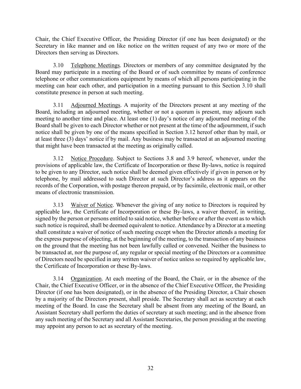 32 Chair, the Chief Executive Officer, the Presiding Director (if one has been designated) or the Secretary in like manner and on like notice on the written request of any two or more of the Directors then serving as Directors. 3.10 Telephone Meetings. Directors or members of any committee designated by the Board may participate in a meeting of the Board or of such committee by means of conference telephone or other communications equipment by means of which all persons participating in the meeting can hear each other, and participation in a meeting pursuant to this Section 3.10 shall constitute presence in person at such meeting. 3.11 Adjourned Meetings. A majority of the Directors present at any meeting of the Board, including an adjourned meeting, whether or not a quorum is present, may adjourn such meeting to another time and place. At least one (1) day’s notice of any adjourned meeting of the Board shall be given to each Director whether or not present at the time of the adjournment, if such notice shall be given by one of the means specified in Section 3.12 hereof other than by mail, or at least three (3) days’ notice if by mail. Any business may be transacted at an adjourned meeting that might have been transacted at the meeting as originally called. 3.12 Notice Procedure. Subject to Sections 3.8 and 3.9 hereof, whenever, under the provisions of applicable law, the Certificate of Incorporation or these By-laws, notice is required to be given to any Director, such notice shall be deemed given effectively if given in person or by telephone, by mail addressed to such Director at such Director’s address as it appears on the records of the Corporation, with postage thereon prepaid, or by facsimile, electronic mail, or other means of electronic transmission. 3.13 Waiver of Notice. Whenever the giving of any notice to Directors is required by applicable law, the Certificate of Incorporation or these By-laws, a waiver thereof, in writing, signed by the person or persons entitled to said notice, whether before or after the event as to which such notice is required, shall be deemed equivalent to notice. Attendance by a Director at a meeting shall constitute a waiver of notice of such meeting except when the Director attends a meeting for the express purpose of objecting, at the beginning of the meeting, to the transaction of any business on the ground that the meeting has not been lawfully called or convened. Neither the business to be transacted at, nor the purpose of, any regular or special meeting of the Directors or a committee of Directors need be specified in any written waiver of notice unless so required by applicable law, the Certificate of Incorporation or these By-laws. 3.14 Organization. At each meeting of the Board, the Chair, or in the absence of the Chair, the Chief Executive Officer, or in the absence of the Chief Executive Officer, the Presiding Director (if one has been designated), or in the absence of the Presiding Director, a Chair chosen by a majority of the Directors present, shall preside. The Secretary shall act as secretary at each meeting of the Board. In case the Secretary shall be absent from any meeting of the Board, an Assistant Secretary shall perform the duties of secretary at such meeting; and in the absence from any such meeting of the Secretary and all Assistant Secretaries, the person presiding at the meeting may appoint any person to act as secretary of the meeting.