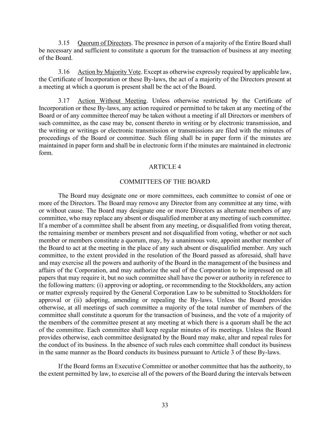 33 3.15 Quorum of Directors. The presence in person of a majority of the Entire Board shall be necessary and sufficient to constitute a quorum for the transaction of business at any meeting of the Board. 3.16 Action by Majority Vote. Except as otherwise expressly required by applicable law, the Certificate of Incorporation or these By-laws, the act of a majority of the Directors present at a meeting at which a quorum is present shall be the act of the Board. 3.17 Action Without Meeting. Unless otherwise restricted by the Certificate of Incorporation or these By-laws, any action required or permitted to be taken at any meeting of the Board or of any committee thereof may be taken without a meeting if all Directors or members of such committee, as the case may be, consent thereto in writing or by electronic transmission, and the writing or writings or electronic transmission or transmissions are filed with the minutes of proceedings of the Board or committee. Such filing shall be in paper form if the minutes are maintained in paper form and shall be in electronic form if the minutes are maintained in electronic form. ARTICLE 4 COMMITTEES OF THE BOARD The Board may designate one or more committees, each committee to consist of one or more of the Directors. The Board may remove any Director from any committee at any time, with or without cause. The Board may designate one or more Directors as alternate members of any committee, who may replace any absent or disqualified member at any meeting of such committee. If a member of a committee shall be absent from any meeting, or disqualified from voting thereat, the remaining member or members present and not disqualified from voting, whether or not such member or members constitute a quorum, may, by a unanimous vote, appoint another member of the Board to act at the meeting in the place of any such absent or disqualified member. Any such committee, to the extent provided in the resolution of the Board passed as aforesaid, shall have and may exercise all the powers and authority of the Board in the management of the business and affairs of the Corporation, and may authorize the seal of the Corporation to be impressed on all papers that may require it, but no such committee shall have the power or authority in reference to the following matters: (i) approving or adopting, or recommending to the Stockholders, any action or matter expressly required by the General Corporation Law to be submitted to Stockholders for approval or (ii) adopting, amending or repealing the By-laws. Unless the Board provides otherwise, at all meetings of such committee a majority of the total number of members of the committee shall constitute a quorum for the transaction of business, and the vote of a majority of the members of the committee present at any meeting at which there is a quorum shall be the act of the committee. Each committee shall keep regular minutes of its meetings. Unless the Board provides otherwise, each committee designated by the Board may make, alter and repeal rules for the conduct of its business. In the absence of such rules each committee shall conduct its business in the same manner as the Board conducts its business pursuant to Article 3 of these By-laws. If the Board forms an Executive Committee or another committee that has the authority, to the extent permitted by law, to exercise all of the powers of the Board during the intervals between