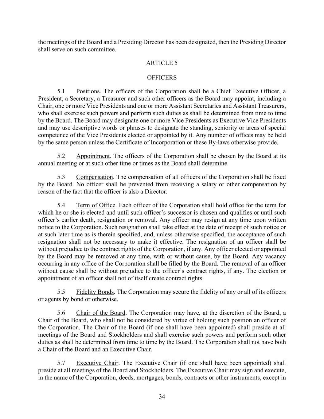 34 the meetings of the Board and a Presiding Director has been designated, then the Presiding Director shall serve on such committee. ARTICLE 5 OFFICERS 5.1 Positions. The officers of the Corporation shall be a Chief Executive Officer, a President, a Secretary, a Treasurer and such other officers as the Board may appoint, including a Chair, one or more Vice Presidents and one or more Assistant Secretaries and Assistant Treasurers, who shall exercise such powers and perform such duties as shall be determined from time to time by the Board. The Board may designate one or more Vice Presidents as Executive Vice Presidents and may use descriptive words or phrases to designate the standing, seniority or areas of special competence of the Vice Presidents elected or appointed by it. Any number of offices may be held by the same person unless the Certificate of Incorporation or these By-laws otherwise provide. 5.2 Appointment. The officers of the Corporation shall be chosen by the Board at its annual meeting or at such other time or times as the Board shall determine. 5.3 Compensation. The compensation of all officers of the Corporation shall be fixed by the Board. No officer shall be prevented from receiving a salary or other compensation by reason of the fact that the officer is also a Director. 5.4 Term of Office. Each officer of the Corporation shall hold office for the term for which he or she is elected and until such officer’s successor is chosen and qualifies or until such officer’s earlier death, resignation or removal. Any officer may resign at any time upon written notice to the Corporation. Such resignation shall take effect at the date of receipt of such notice or at such later time as is therein specified, and, unless otherwise specified, the acceptance of such resignation shall not be necessary to make it effective. The resignation of an officer shall be without prejudice to the contract rights of the Corporation, if any. Any officer elected or appointed by the Board may be removed at any time, with or without cause, by the Board. Any vacancy occurring in any office of the Corporation shall be filled by the Board. The removal of an officer without cause shall be without prejudice to the officer’s contract rights, if any. The election or appointment of an officer shall not of itself create contract rights. 5.5 Fidelity Bonds. The Corporation may secure the fidelity of any or all of its officers or agents by bond or otherwise. 5.6 Chair of the Board. The Corporation may have, at the discretion of the Board, a Chair of the Board, who shall not be considered by virtue of holding such position an officer of the Corporation. The Chair of the Board (if one shall have been appointed) shall preside at all meetings of the Board and Stockholders and shall exercise such powers and perform such other duties as shall be determined from time to time by the Board. The Corporation shall not have both a Chair of the Board and an Executive Chair. 5.7 Executive Chair. The Executive Chair (if one shall have been appointed) shall preside at all meetings of the Board and Stockholders. The Executive Chair may sign and execute, in the name of the Corporation, deeds, mortgages, bonds, contracts or other instruments, except in