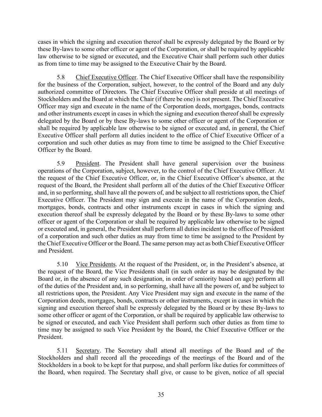 35 cases in which the signing and execution thereof shall be expressly delegated by the Board or by these By-laws to some other officer or agent of the Corporation, or shall be required by applicable law otherwise to be signed or executed, and the Executive Chair shall perform such other duties as from time to time may be assigned to the Executive Chair by the Board. 5.8 Chief Executive Officer. The Chief Executive Officer shall have the responsibility for the business of the Corporation, subject, however, to the control of the Board and any duly authorized committee of Directors. The Chief Executive Officer shall preside at all meetings of Stockholders and the Board at which the Chair (if there be one) is not present. The Chief Executive Officer may sign and execute in the name of the Corporation deeds, mortgages, bonds, contracts and other instruments except in cases in which the signing and execution thereof shall be expressly delegated by the Board or by these By-laws to some other officer or agent of the Corporation or shall be required by applicable law otherwise to be signed or executed and, in general, the Chief Executive Officer shall perform all duties incident to the office of Chief Executive Officer of a corporation and such other duties as may from time to time be assigned to the Chief Executive Officer by the Board. 5.9 President. The President shall have general supervision over the business operations of the Corporation, subject, however, to the control of the Chief Executive Officer. At the request of the Chief Executive Officer, or, in the Chief Executive Officer’s absence, at the request of the Board, the President shall perform all of the duties of the Chief Executive Officer and, in so performing, shall have all the powers of, and be subject to all restrictions upon, the Chief Executive Officer. The President may sign and execute in the name of the Corporation deeds, mortgages, bonds, contracts and other instruments except in cases in which the signing and execution thereof shall be expressly delegated by the Board or by these By-laws to some other officer or agent of the Corporation or shall be required by applicable law otherwise to be signed or executed and, in general, the President shall perform all duties incident to the office of President of a corporation and such other duties as may from time to time be assigned to the President by the Chief Executive Officer or the Board. The same person may act as both Chief Executive Officer and President. 5.10 Vice Presidents. At the request of the President, or, in the President’s absence, at the request of the Board, the Vice Presidents shall (in such order as may be designated by the Board or, in the absence of any such designation, in order of seniority based on age) perform all of the duties of the President and, in so performing, shall have all the powers of, and be subject to all restrictions upon, the President. Any Vice President may sign and execute in the name of the Corporation deeds, mortgages, bonds, contracts or other instruments, except in cases in which the signing and execution thereof shall be expressly delegated by the Board or by these By-laws to some other officer or agent of the Corporation, or shall be required by applicable law otherwise to be signed or executed, and each Vice President shall perform such other duties as from time to time may be assigned to such Vice President by the Board, the Chief Executive Officer or the President. 5.11 Secretary. The Secretary shall attend all meetings of the Board and of the Stockholders and shall record all the proceedings of the meetings of the Board and of the Stockholders in a book to be kept for that purpose, and shall perform like duties for committees of the Board, when required. The Secretary shall give, or cause to be given, notice of all special