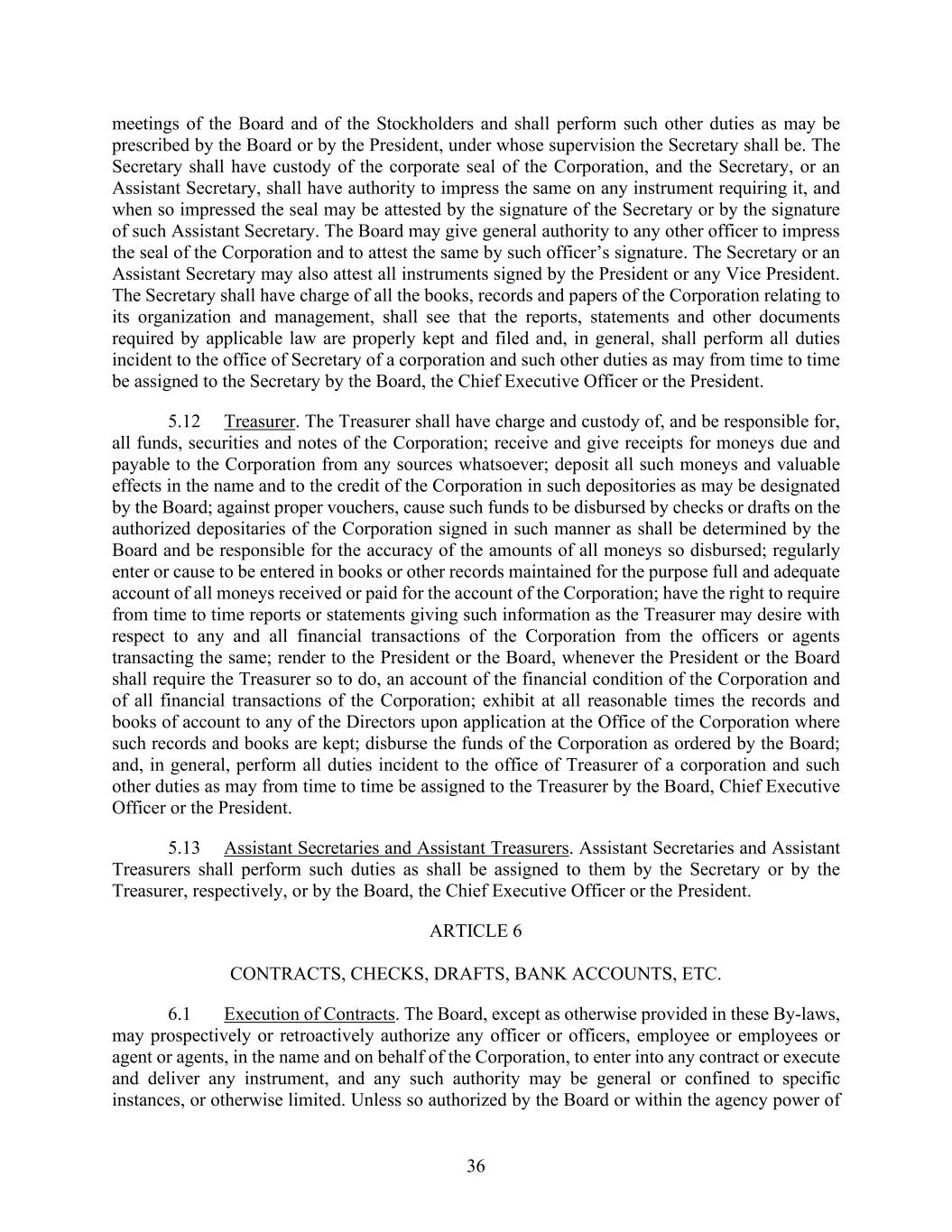 36 meetings of the Board and of the Stockholders and shall perform such other duties as may be prescribed by the Board or by the President, under whose supervision the Secretary shall be. The Secretary shall have custody of the corporate seal of the Corporation, and the Secretary, or an Assistant Secretary, shall have authority to impress the same on any instrument requiring it, and when so impressed the seal may be attested by the signature of the Secretary or by the signature of such Assistant Secretary. The Board may give general authority to any other officer to impress the seal of the Corporation and to attest the same by such officer’s signature. The Secretary or an Assistant Secretary may also attest all instruments signed by the President or any Vice President. The Secretary shall have charge of all the books, records and papers of the Corporation relating to its organization and management, shall see that the reports, statements and other documents required by applicable law are properly kept and filed and, in general, shall perform all duties incident to the office of Secretary of a corporation and such other duties as may from time to time be assigned to the Secretary by the Board, the Chief Executive Officer or the President. 5.12 Treasurer. The Treasurer shall have charge and custody of, and be responsible for, all funds, securities and notes of the Corporation; receive and give receipts for moneys due and payable to the Corporation from any sources whatsoever; deposit all such moneys and valuable effects in the name and to the credit of the Corporation in such depositories as may be designated by the Board; against proper vouchers, cause such funds to be disbursed by checks or drafts on the authorized depositaries of the Corporation signed in such manner as shall be determined by the Board and be responsible for the accuracy of the amounts of all moneys so disbursed; regularly enter or cause to be entered in books or other records maintained for the purpose full and adequate account of all moneys received or paid for the account of the Corporation; have the right to require from time to time reports or statements giving such information as the Treasurer may desire with respect to any and all financial transactions of the Corporation from the officers or agents transacting the same; render to the President or the Board, whenever the President or the Board shall require the Treasurer so to do, an account of the financial condition of the Corporation and of all financial transactions of the Corporation; exhibit at all reasonable times the records and books of account to any of the Directors upon application at the Office of the Corporation where such records and books are kept; disburse the funds of the Corporation as ordered by the Board; and, in general, perform all duties incident to the office of Treasurer of a corporation and such other duties as may from time to time be assigned to the Treasurer by the Board, Chief Executive Officer or the President. 5.13 Assistant Secretaries and Assistant Treasurers. Assistant Secretaries and Assistant Treasurers shall perform such duties as shall be assigned to them by the Secretary or by the Treasurer, respectively, or by the Board, the Chief Executive Officer or the President. ARTICLE 6 CONTRACTS, CHECKS, DRAFTS, BANK ACCOUNTS, ETC. 6.1 Execution of Contracts. The Board, except as otherwise provided in these By-laws, may prospectively or retroactively authorize any officer or officers, employee or employees or agent or agents, in the name and on behalf of the Corporation, to enter into any contract or execute and deliver any instrument, and any such authority may be general or confined to specific instances, or otherwise limited. Unless so authorized by the Board or within the agency power of