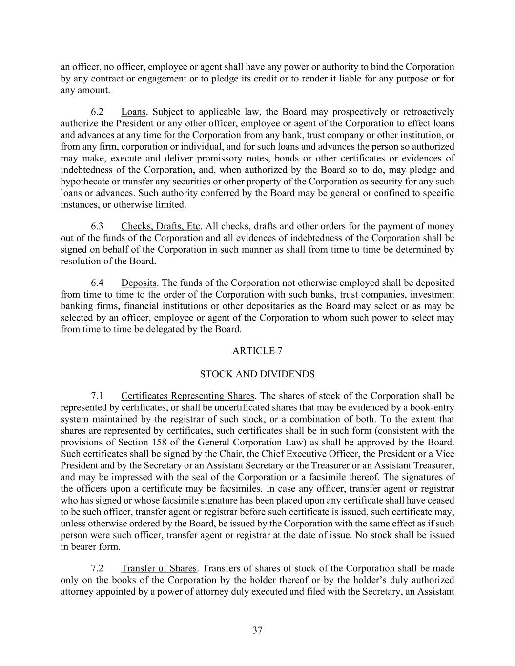 37 an officer, no officer, employee or agent shall have any power or authority to bind the Corporation by any contract or engagement or to pledge its credit or to render it liable for any purpose or for any amount. 6.2 Loans. Subject to applicable law, the Board may prospectively or retroactively authorize the President or any other officer, employee or agent of the Corporation to effect loans and advances at any time for the Corporation from any bank, trust company or other institution, or from any firm, corporation or individual, and for such loans and advances the person so authorized may make, execute and deliver promissory notes, bonds or other certificates or evidences of indebtedness of the Corporation, and, when authorized by the Board so to do, may pledge and hypothecate or transfer any securities or other property of the Corporation as security for any such loans or advances. Such authority conferred by the Board may be general or confined to specific instances, or otherwise limited. 6.3 Checks, Drafts, Etc. All checks, drafts and other orders for the payment of money out of the funds of the Corporation and all evidences of indebtedness of the Corporation shall be signed on behalf of the Corporation in such manner as shall from time to time be determined by resolution of the Board. 6.4 Deposits. The funds of the Corporation not otherwise employed shall be deposited from time to time to the order of the Corporation with such banks, trust companies, investment banking firms, financial institutions or other depositaries as the Board may select or as may be selected by an officer, employee or agent of the Corporation to whom such power to select may from time to time be delegated by the Board. ARTICLE 7 STOCK AND DIVIDENDS 7.1 Certificates Representing Shares. The shares of stock of the Corporation shall be represented by certificates, or shall be uncertificated shares that may be evidenced by a book-entry system maintained by the registrar of such stock, or a combination of both. To the extent that shares are represented by certificates, such certificates shall be in such form (consistent with the provisions of Section 158 of the General Corporation Law) as shall be approved by the Board. Such certificates shall be signed by the Chair, the Chief Executive Officer, the President or a Vice President and by the Secretary or an Assistant Secretary or the Treasurer or an Assistant Treasurer, and may be impressed with the seal of the Corporation or a facsimile thereof. The signatures of the officers upon a certificate may be facsimiles. In case any officer, transfer agent or registrar who has signed or whose facsimile signature has been placed upon any certificate shall have ceased to be such officer, transfer agent or registrar before such certificate is issued, such certificate may, unless otherwise ordered by the Board, be issued by the Corporation with the same effect as if such person were such officer, transfer agent or registrar at the date of issue. No stock shall be issued in bearer form. 7.2 Transfer of Shares. Transfers of shares of stock of the Corporation shall be made only on the books of the Corporation by the holder thereof or by the holder’s duly authorized attorney appointed by a power of attorney duly executed and filed with the Secretary, an Assistant