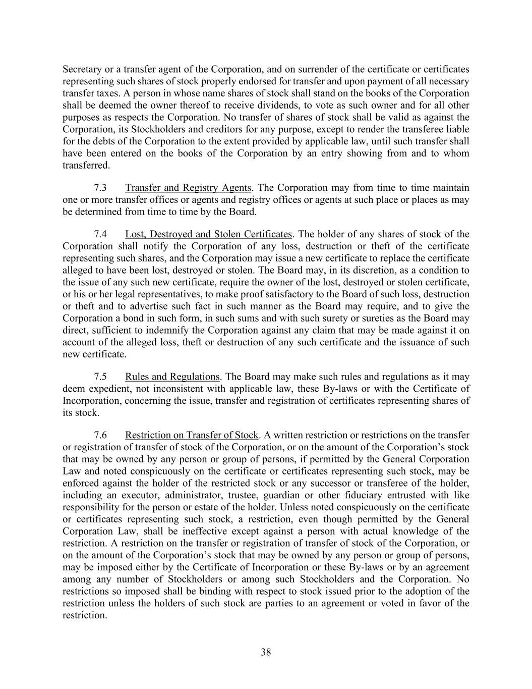 38 Secretary or a transfer agent of the Corporation, and on surrender of the certificate or certificates representing such shares of stock properly endorsed for transfer and upon payment of all necessary transfer taxes. A person in whose name shares of stock shall stand on the books of the Corporation shall be deemed the owner thereof to receive dividends, to vote as such owner and for all other purposes as respects the Corporation. No transfer of shares of stock shall be valid as against the Corporation, its Stockholders and creditors for any purpose, except to render the transferee liable for the debts of the Corporation to the extent provided by applicable law, until such transfer shall have been entered on the books of the Corporation by an entry showing from and to whom transferred. 7.3 Transfer and Registry Agents. The Corporation may from time to time maintain one or more transfer offices or agents and registry offices or agents at such place or places as may be determined from time to time by the Board. 7.4 Lost, Destroyed and Stolen Certificates. The holder of any shares of stock of the Corporation shall notify the Corporation of any loss, destruction or theft of the certificate representing such shares, and the Corporation may issue a new certificate to replace the certificate alleged to have been lost, destroyed or stolen. The Board may, in its discretion, as a condition to the issue of any such new certificate, require the owner of the lost, destroyed or stolen certificate, or his or her legal representatives, to make proof satisfactory to the Board of such loss, destruction or theft and to advertise such fact in such manner as the Board may require, and to give the Corporation a bond in such form, in such sums and with such surety or sureties as the Board may direct, sufficient to indemnify the Corporation against any claim that may be made against it on account of the alleged loss, theft or destruction of any such certificate and the issuance of such new certificate. 7.5 Rules and Regulations. The Board may make such rules and regulations as it may deem expedient, not inconsistent with applicable law, these By-laws or with the Certificate of Incorporation, concerning the issue, transfer and registration of certificates representing shares of its stock. 7.6 Restriction on Transfer of Stock. A written restriction or restrictions on the transfer or registration of transfer of stock of the Corporation, or on the amount of the Corporation’s stock that may be owned by any person or group of persons, if permitted by the General Corporation Law and noted conspicuously on the certificate or certificates representing such stock, may be enforced against the holder of the restricted stock or any successor or transferee of the holder, including an executor, administrator, trustee, guardian or other fiduciary entrusted with like responsibility for the person or estate of the holder. Unless noted conspicuously on the certificate or certificates representing such stock, a restriction, even though permitted by the General Corporation Law, shall be ineffective except against a person with actual knowledge of the restriction. A restriction on the transfer or registration of transfer of stock of the Corporation, or on the amount of the Corporation’s stock that may be owned by any person or group of persons, may be imposed either by the Certificate of Incorporation or these By-laws or by an agreement among any number of Stockholders or among such Stockholders and the Corporation. No restrictions so imposed shall be binding with respect to stock issued prior to the adoption of the restriction unless the holders of such stock are parties to an agreement or voted in favor of the restriction.