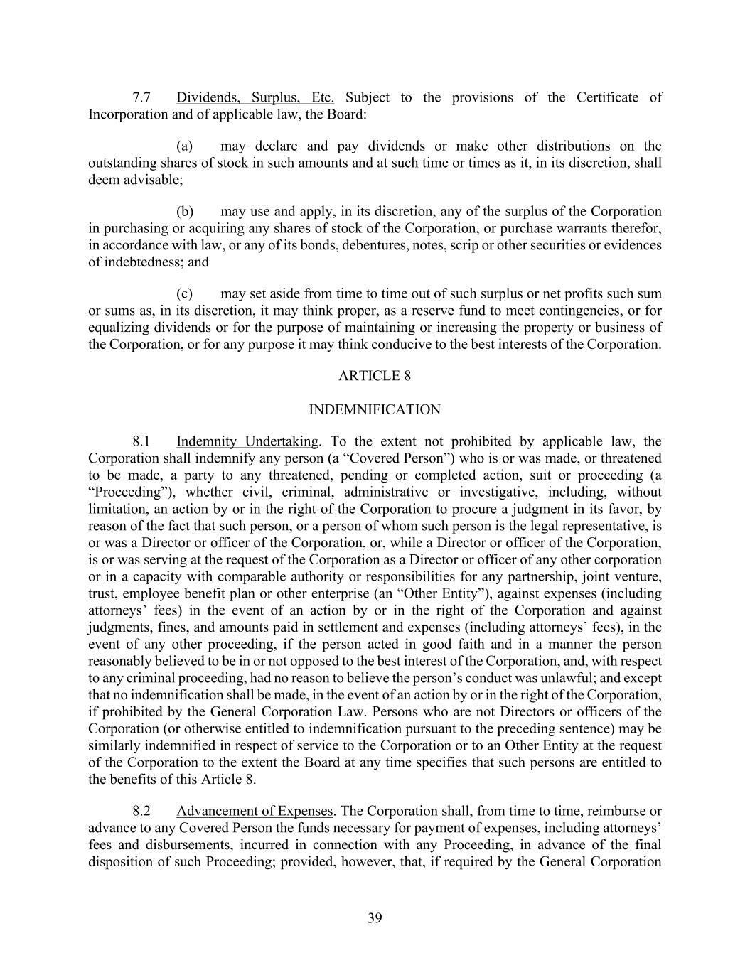39 7.7 Dividends, Surplus, Etc. Subject to the provisions of the Certificate of Incorporation and of applicable law, the Board: (a) may declare and pay dividends or make other distributions on the outstanding shares of stock in such amounts and at such time or times as it, in its discretion, shall deem advisable; (b) may use and apply, in its discretion, any of the surplus of the Corporation in purchasing or acquiring any shares of stock of the Corporation, or purchase warrants therefor, in accordance with law, or any of its bonds, debentures, notes, scrip or other securities or evidences of indebtedness; and (c) may set aside from time to time out of such surplus or net profits such sum or sums as, in its discretion, it may think proper, as a reserve fund to meet contingencies, or for equalizing dividends or for the purpose of maintaining or increasing the property or business of the Corporation, or for any purpose it may think conducive to the best interests of the Corporation. ARTICLE 8 INDEMNIFICATION 8.1 Indemnity Undertaking. To the extent not prohibited by applicable law, the Corporation shall indemnify any person (a “Covered Person”) who is or was made, or threatened to be made, a party to any threatened, pending or completed action, suit or proceeding (a “Proceeding”), whether civil, criminal, administrative or investigative, including, without limitation, an action by or in the right of the Corporation to procure a judgment in its favor, by reason of the fact that such person, or a person of whom such person is the legal representative, is or was a Director or officer of the Corporation, or, while a Director or officer of the Corporation, is or was serving at the request of the Corporation as a Director or officer of any other corporation or in a capacity with comparable authority or responsibilities for any partnership, joint venture, trust, employee benefit plan or other enterprise (an “Other Entity”), against expenses (including attorneys’ fees) in the event of an action by or in the right of the Corporation and against judgments, fines, and amounts paid in settlement and expenses (including attorneys’ fees), in the event of any other proceeding, if the person acted in good faith and in a manner the person reasonably believed to be in or not opposed to the best interest of the Corporation, and, with respect to any criminal proceeding, had no reason to believe the person’s conduct was unlawful; and except that no indemnification shall be made, in the event of an action by or in the right of the Corporation, if prohibited by the General Corporation Law. Persons who are not Directors or officers of the Corporation (or otherwise entitled to indemnification pursuant to the preceding sentence) may be similarly indemnified in respect of service to the Corporation or to an Other Entity at the request of the Corporation to the extent the Board at any time specifies that such persons are entitled to the benefits of this Article 8. 8.2 Advancement of Expenses. The Corporation shall, from time to time, reimburse or advance to any Covered Person the funds necessary for payment of expenses, including attorneys’ fees and disbursements, incurred in connection with any Proceeding, in advance of the final disposition of such Proceeding; provided, however, that, if required by the General Corporation