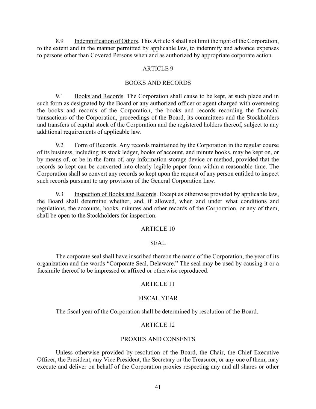 41 8.9 Indemnification of Others. This Article 8 shall not limit the right of the Corporation, to the extent and in the manner permitted by applicable law, to indemnify and advance expenses to persons other than Covered Persons when and as authorized by appropriate corporate action. ARTICLE 9 BOOKS AND RECORDS 9.1 Books and Records. The Corporation shall cause to be kept, at such place and in such form as designated by the Board or any authorized officer or agent charged with overseeing the books and records of the Corporation, the books and records recording the financial transactions of the Corporation, proceedings of the Board, its committees and the Stockholders and transfers of capital stock of the Corporation and the registered holders thereof, subject to any additional requirements of applicable law. 9.2 Form of Records. Any records maintained by the Corporation in the regular course of its business, including its stock ledger, books of account, and minute books, may be kept on, or by means of, or be in the form of, any information storage device or method, provided that the records so kept can be converted into clearly legible paper form within a reasonable time. The Corporation shall so convert any records so kept upon the request of any person entitled to inspect such records pursuant to any provision of the General Corporation Law. 9.3 Inspection of Books and Records. Except as otherwise provided by applicable law, the Board shall determine whether, and, if allowed, when and under what conditions and regulations, the accounts, books, minutes and other records of the Corporation, or any of them, shall be open to the Stockholders for inspection. ARTICLE 10 SEAL The corporate seal shall have inscribed thereon the name of the Corporation, the year of its organization and the words “Corporate Seal, Delaware.” The seal may be used by causing it or a facsimile thereof to be impressed or affixed or otherwise reproduced. ARTICLE 11 FISCAL YEAR The fiscal year of the Corporation shall be determined by resolution of the Board. ARTICLE 12 PROXIES AND CONSENTS Unless otherwise provided by resolution of the Board, the Chair, the Chief Executive Officer, the President, any Vice President, the Secretary or the Treasurer, or any one of them, may execute and deliver on behalf of the Corporation proxies respecting any and all shares or other
