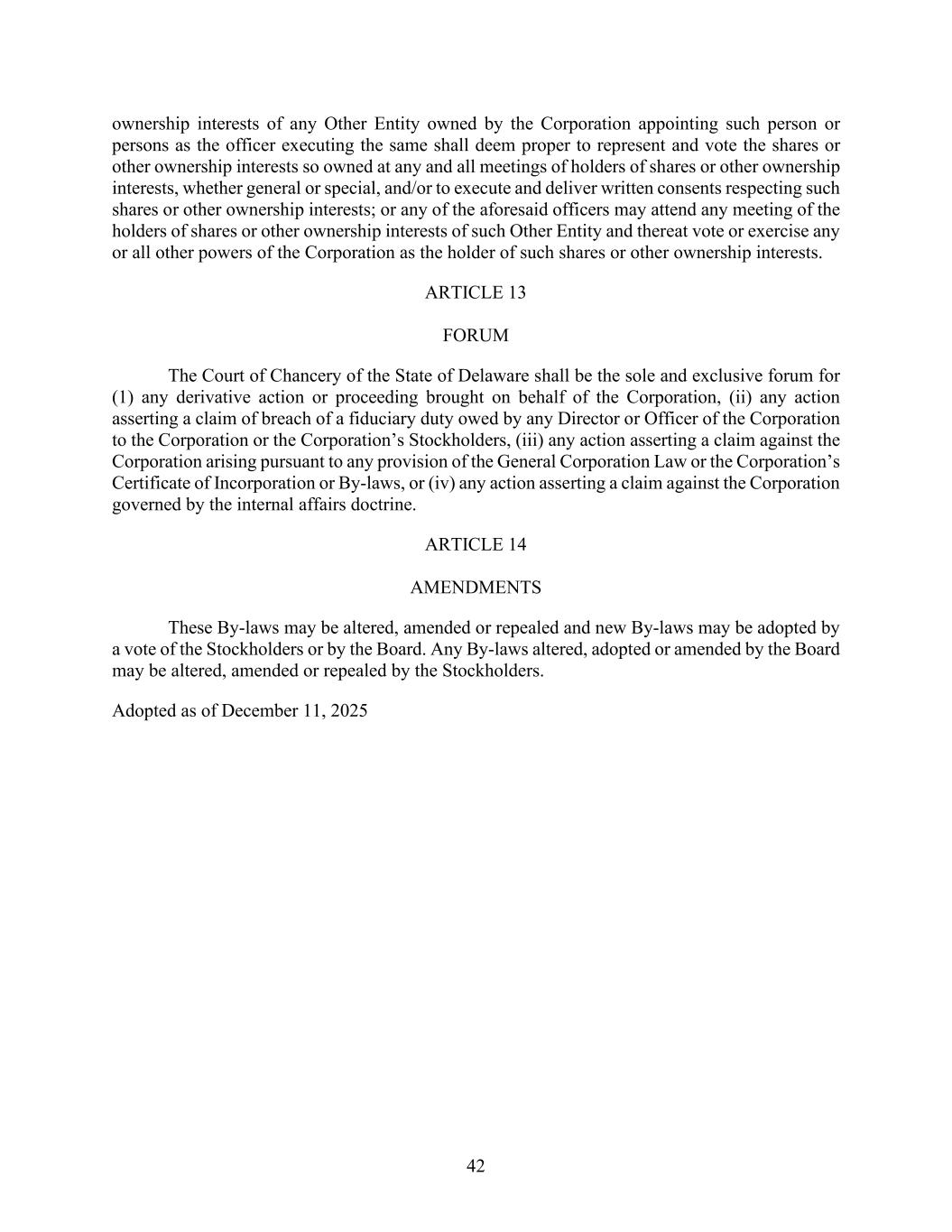 42 ownership interests of any Other Entity owned by the Corporation appointing such person or persons as the officer executing the same shall deem proper to represent and vote the shares or other ownership interests so owned at any and all meetings of holders of shares or other ownership interests, whether general or special, and/or to execute and deliver written consents respecting such shares or other ownership interests; or any of the aforesaid officers may attend any meeting of the holders of shares or other ownership interests of such Other Entity and thereat vote or exercise any or all other powers of the Corporation as the holder of such shares or other ownership interests. ARTICLE 13 FORUM The Court of Chancery of the State of Delaware shall be the sole and exclusive forum for (1) any derivative action or proceeding brought on behalf of the Corporation, (ii) any action asserting a claim of breach of a fiduciary duty owed by any Director or Officer of the Corporation to the Corporation or the Corporation’s Stockholders, (iii) any action asserting a claim against the Corporation arising pursuant to any provision of the General Corporation Law or the Corporation’s Certificate of Incorporation or By-laws, or (iv) any action asserting a claim against the Corporation governed by the internal affairs doctrine. ARTICLE 14 AMENDMENTS These By-laws may be altered, amended or repealed and new By-laws may be adopted by a vote of the Stockholders or by the Board. Any By-laws altered, adopted or amended by the Board may be altered, amended or repealed by the Stockholders. Adopted as of December 11, 2025